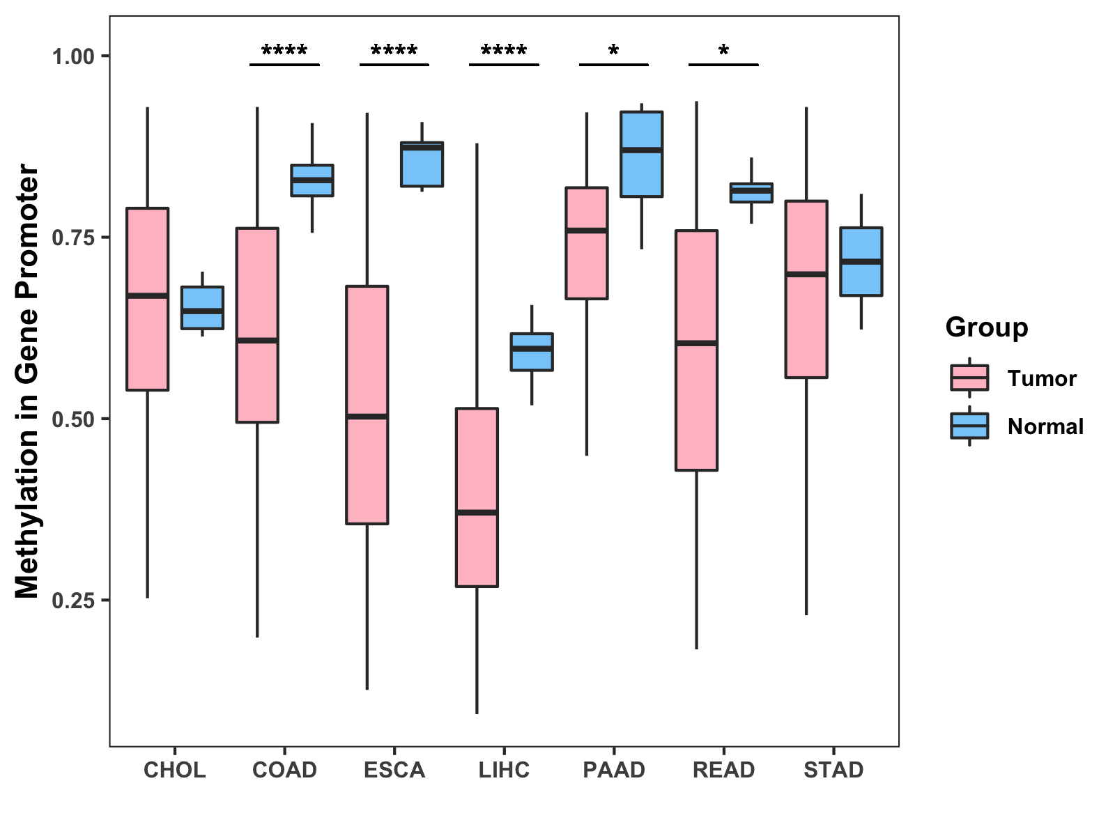 Boxplot of All Gastrointestinal Cancer ( * : 0.01-0.05 , ** : 0.005-0.01 , *** : 0.0001-0.005 , **** : < 0.0001 ) |