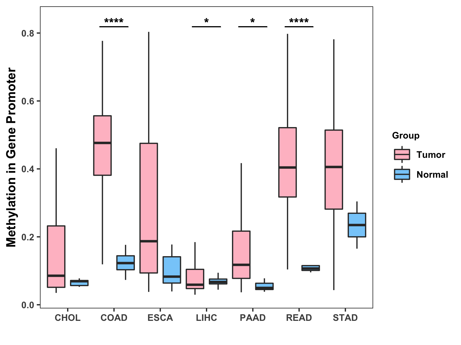 Boxplot of All Gastrointestinal Cancer ( * : 0.01-0.05 , ** : 0.005-0.01 , *** : 0.0001-0.005 , **** : < 0.0001 ) |