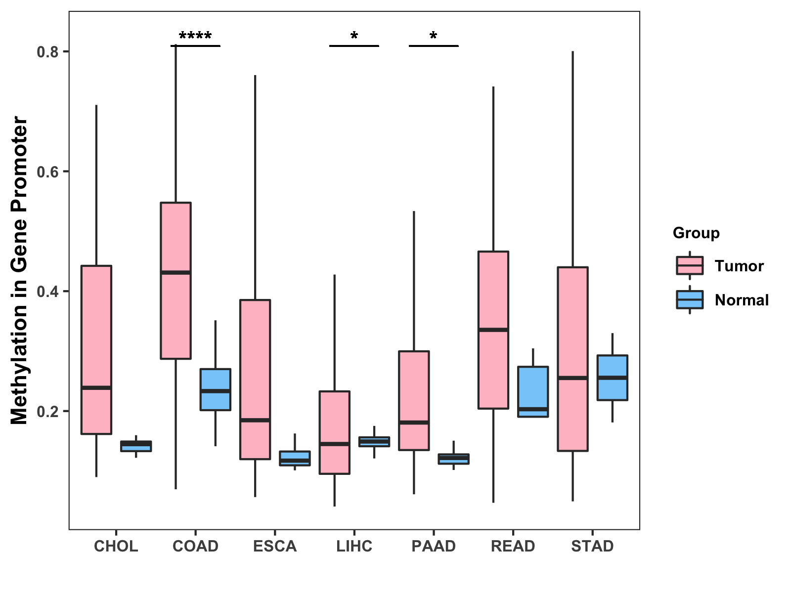 Boxplot of All Gastrointestinal Cancer ( * : 0.01-0.05 , ** : 0.005-0.01 , *** : 0.0001-0.005 , **** : < 0.0001 ) |