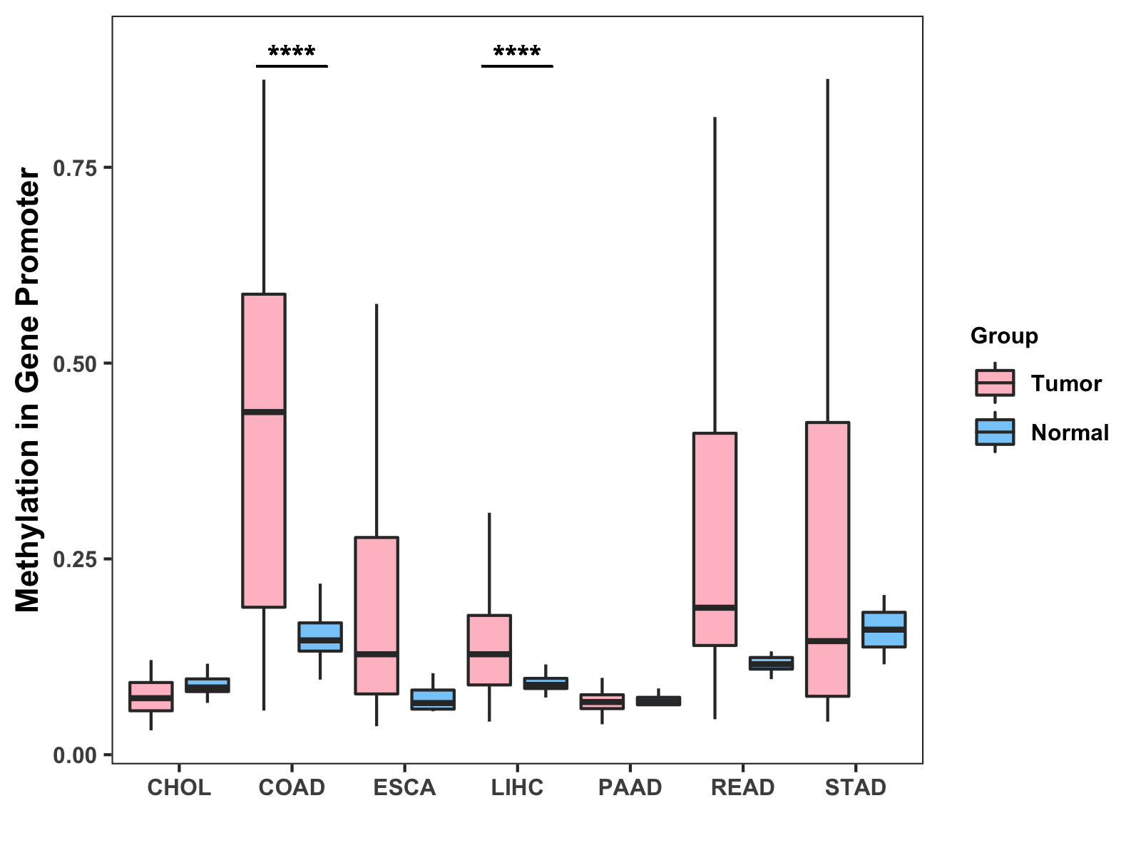 Boxplot of All Gastrointestinal Cancer ( * : 0.01-0.05 , ** : 0.005-0.01 , *** : 0.0001-0.005 , **** : < 0.0001 ) |
