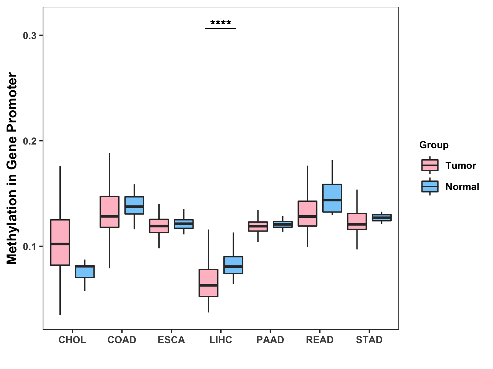 Boxplot of All Gastrointestinal Cancer ( * : 0.01-0.05 , ** : 0.005-0.01 , *** : 0.0001-0.005 , **** : < 0.0001 ) |