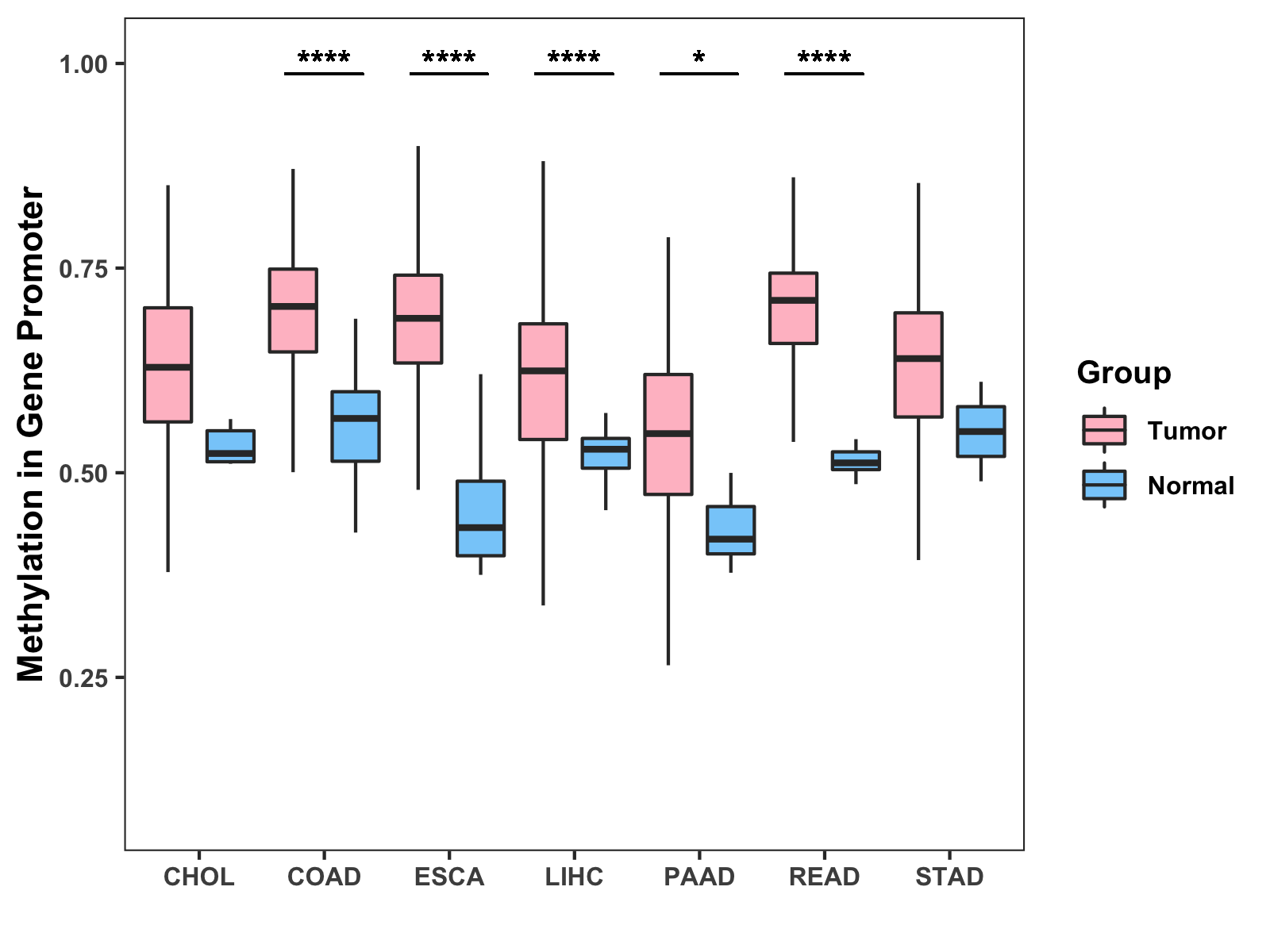 Boxplot of All Gastrointestinal Cancer ( * : 0.01-0.05 , ** : 0.005-0.01 , *** : 0.0001-0.005 , **** : < 0.0001 ) |