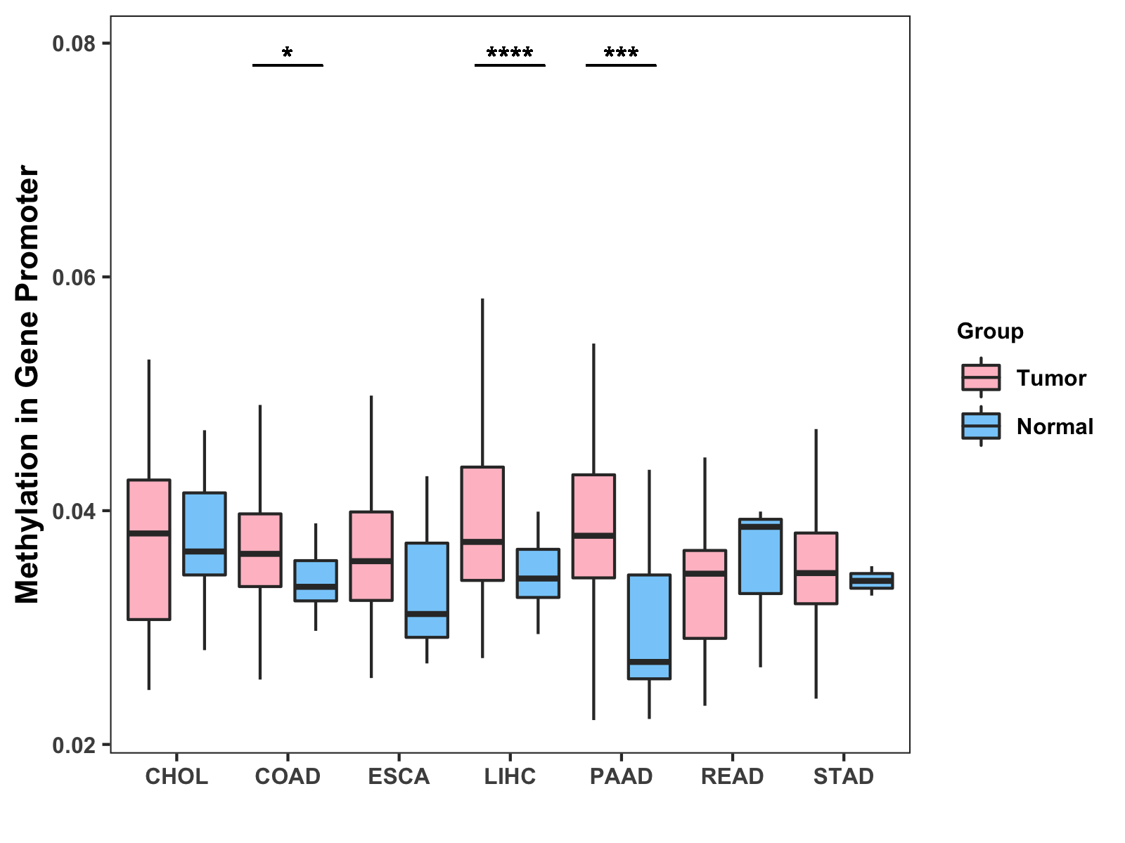 Boxplot of All Gastrointestinal Cancer ( * : 0.01-0.05 , ** : 0.005-0.01 , *** : 0.0001-0.005 , **** : < 0.0001 ) |