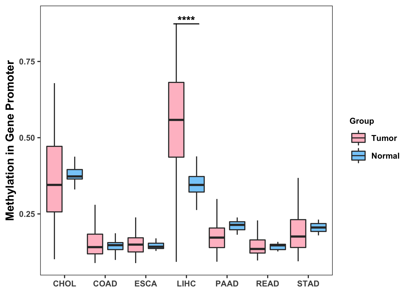 Boxplot of All Gastrointestinal Cancer ( * : 0.01-0.05 , ** : 0.005-0.01 , *** : 0.0001-0.005 , **** : < 0.0001 ) |