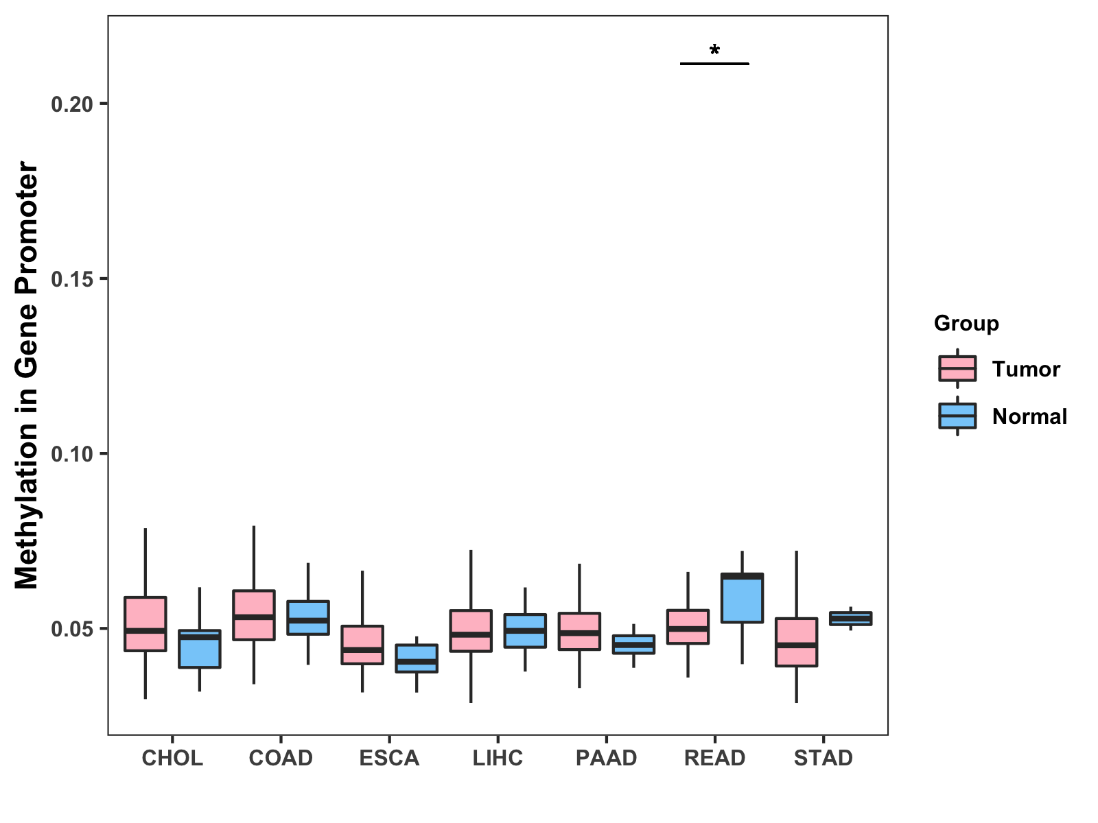 Boxplot of All Gastrointestinal Cancer ( * : 0.01-0.05 , ** : 0.005-0.01 , *** : 0.0001-0.005 , **** : < 0.0001 ) |