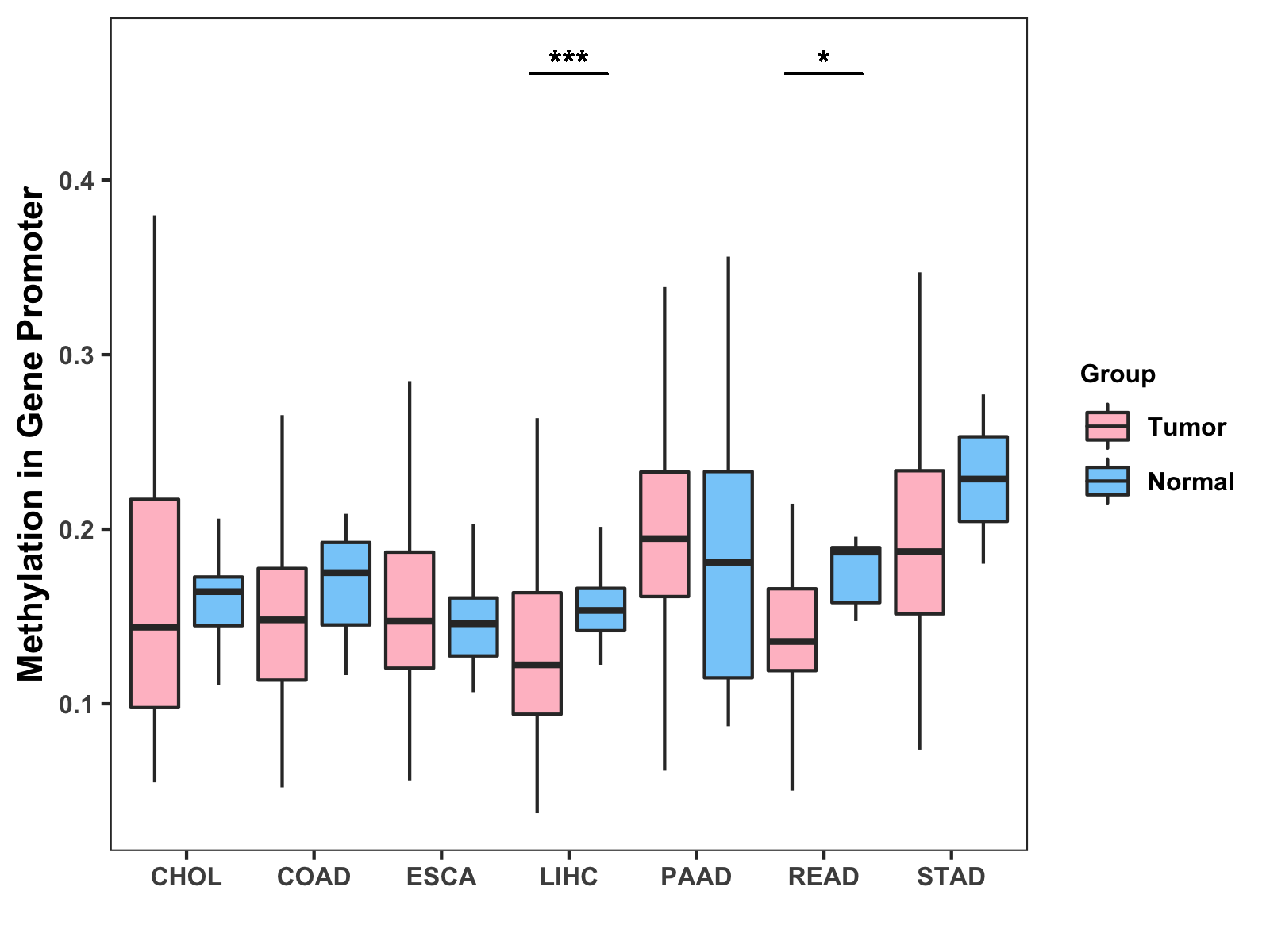 Boxplot of All Gastrointestinal Cancer ( * : 0.01-0.05 , ** : 0.005-0.01 , *** : 0.0001-0.005 , **** : < 0.0001 ) |