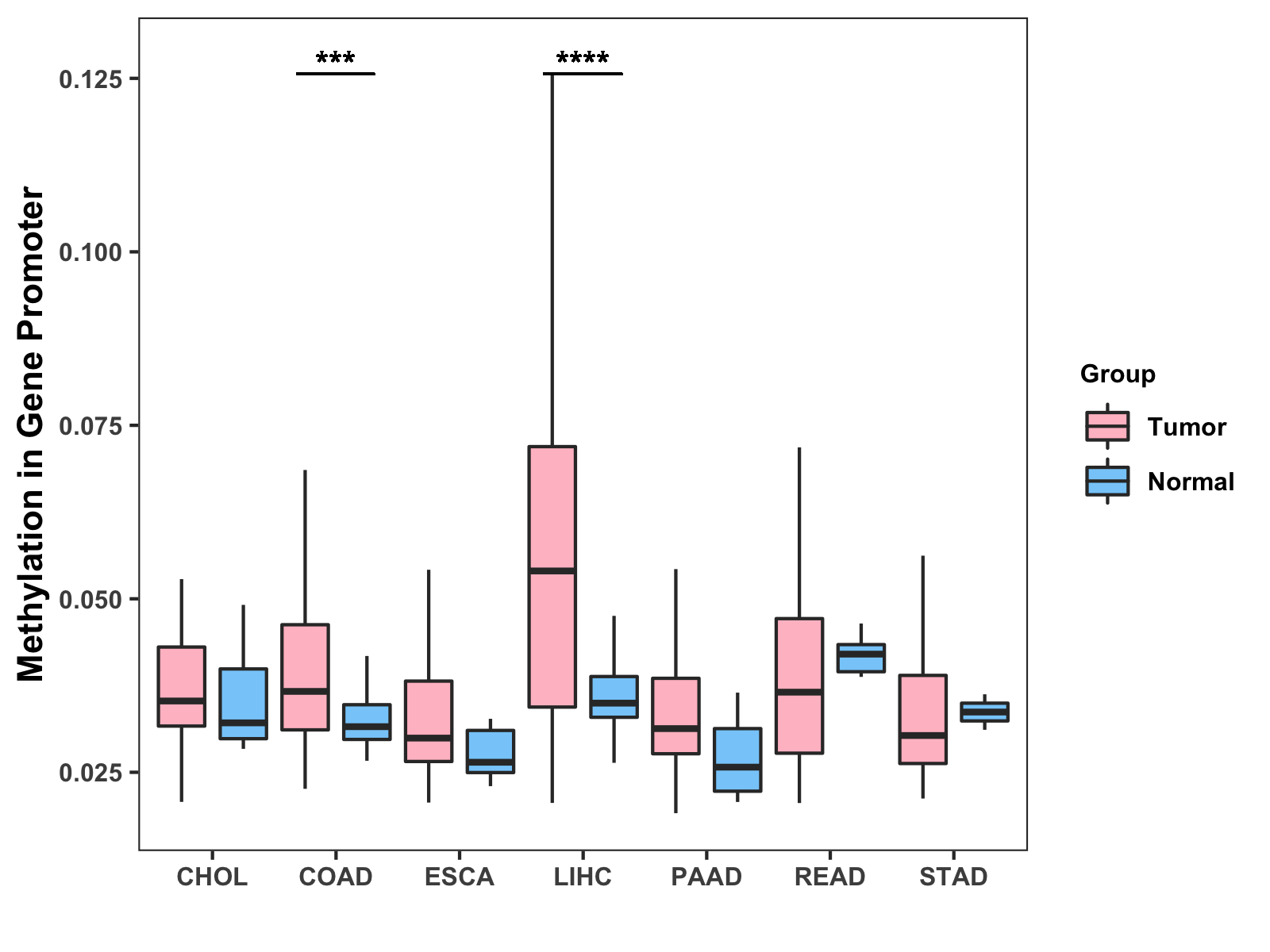 Boxplot of All Gastrointestinal Cancer ( * : 0.01-0.05 , ** : 0.005-0.01 , *** : 0.0001-0.005 , **** : < 0.0001 ) |