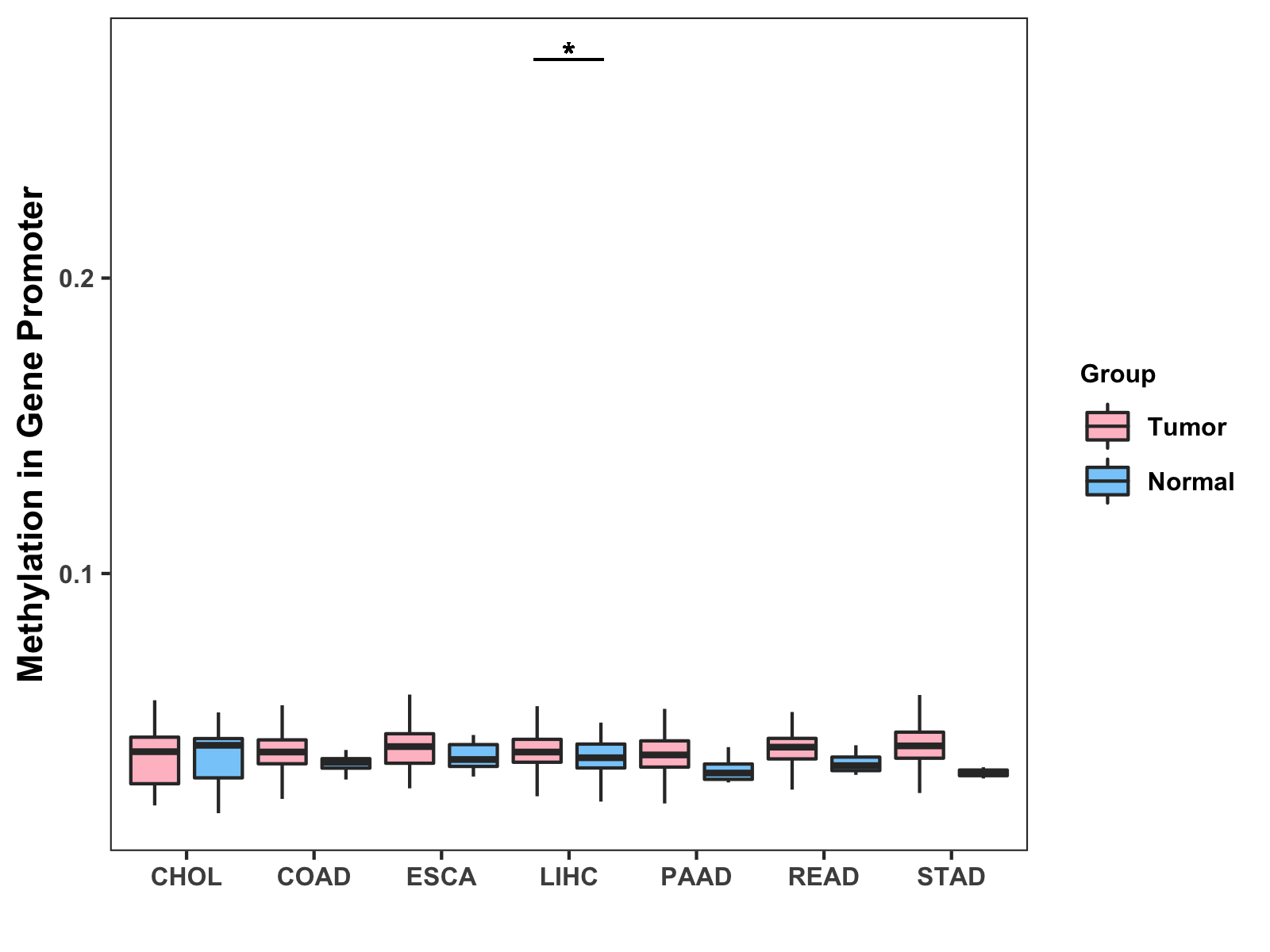 Boxplot of All Gastrointestinal Cancer ( * : 0.01-0.05 , ** : 0.005-0.01 , *** : 0.0001-0.005 , **** : < 0.0001 ) |