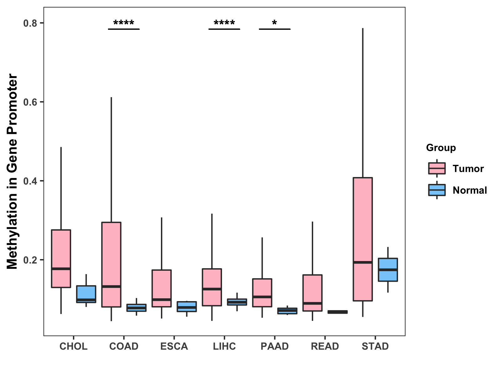 Boxplot of All Gastrointestinal Cancer ( * : 0.01-0.05 , ** : 0.005-0.01 , *** : 0.0001-0.005 , **** : < 0.0001 ) |