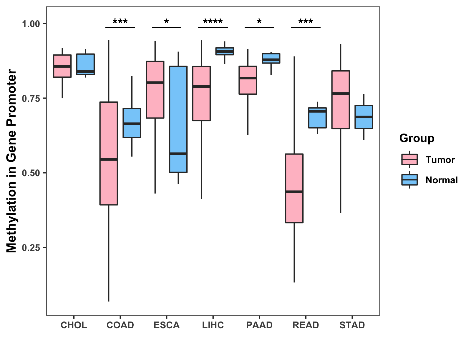 Boxplot of All Gastrointestinal Cancer ( * : 0.01-0.05 , ** : 0.005-0.01 , *** : 0.0001-0.005 , **** : < 0.0001 ) |