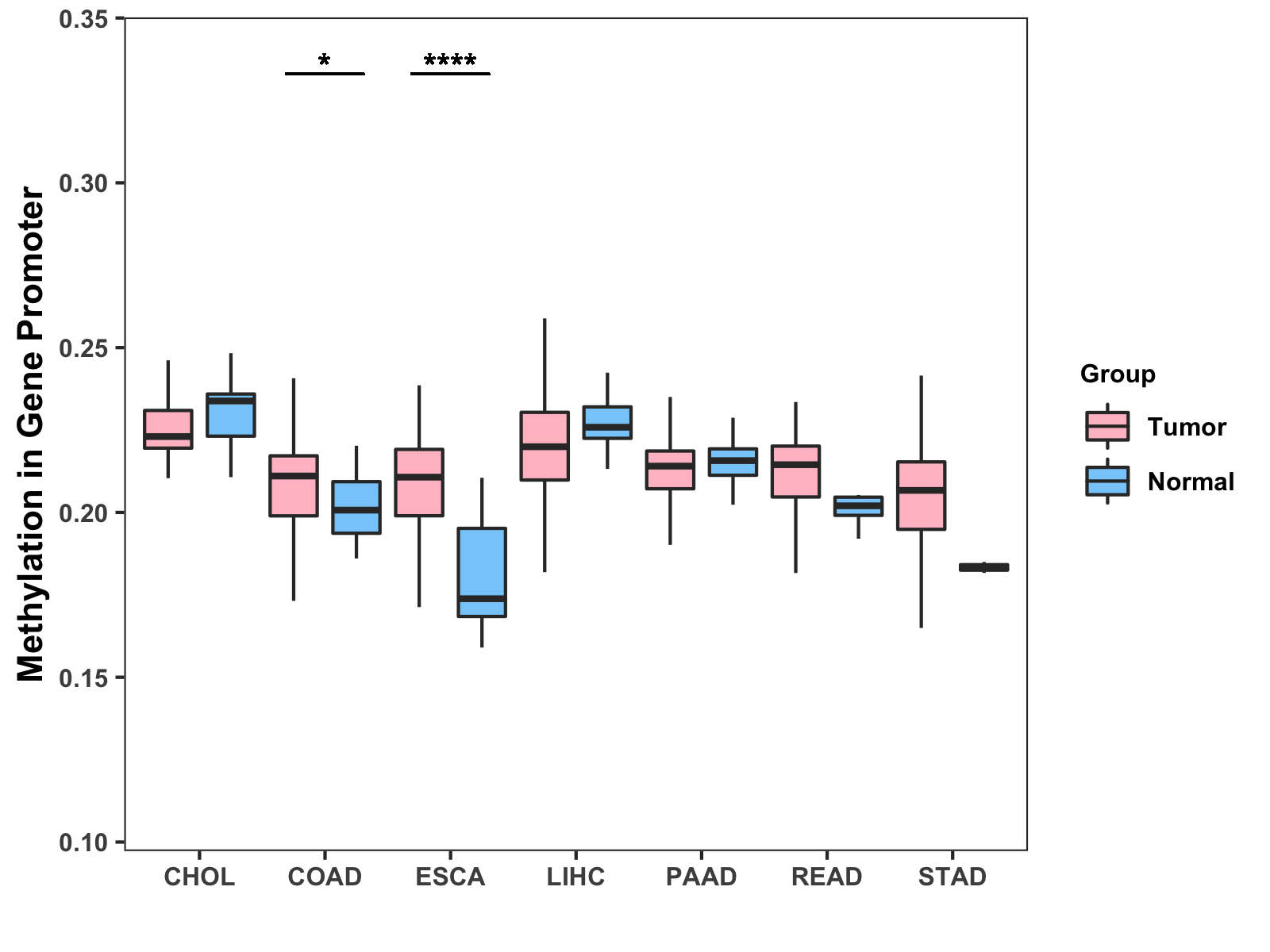 Boxplot of All Gastrointestinal Cancer ( * : 0.01-0.05 , ** : 0.005-0.01 , *** : 0.0001-0.005 , **** : < 0.0001 ) |