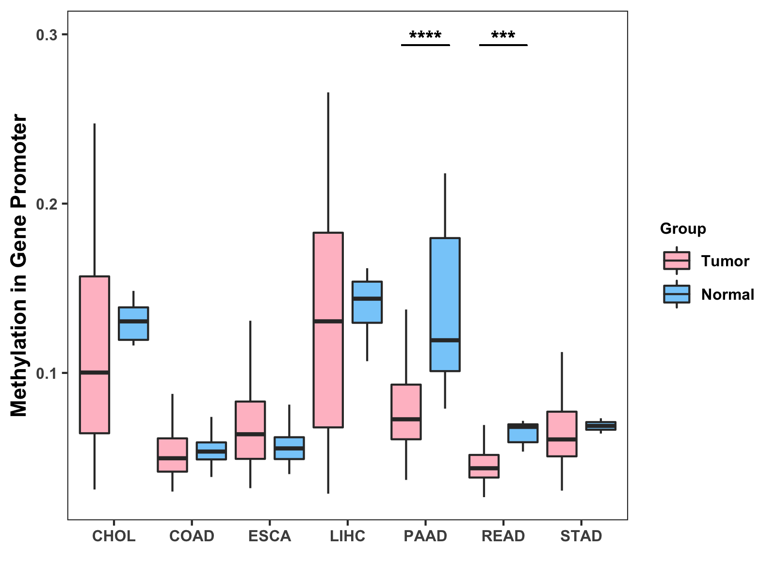 Boxplot of All Gastrointestinal Cancer ( * : 0.01-0.05 , ** : 0.005-0.01 , *** : 0.0001-0.005 , **** : < 0.0001 ) |