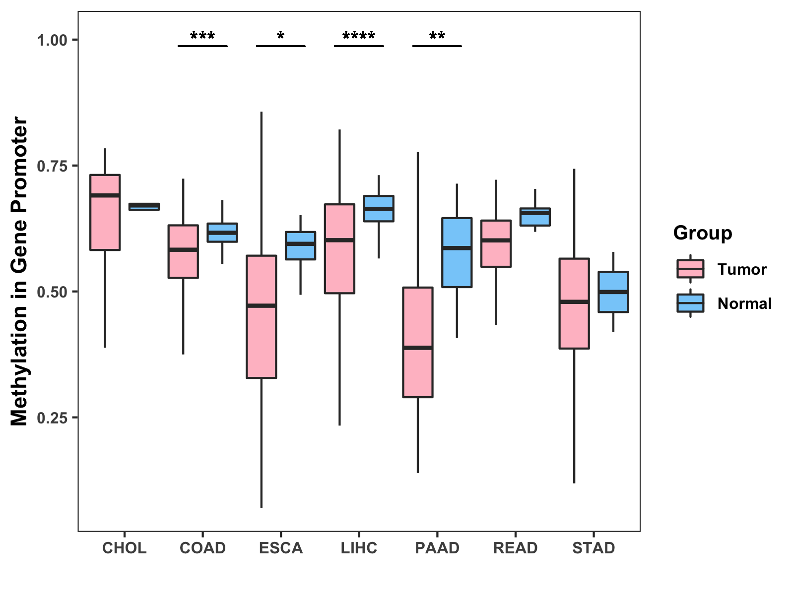 Boxplot of All Gastrointestinal Cancer ( * : 0.01-0.05 , ** : 0.005-0.01 , *** : 0.0001-0.005 , **** : < 0.0001 ) |
