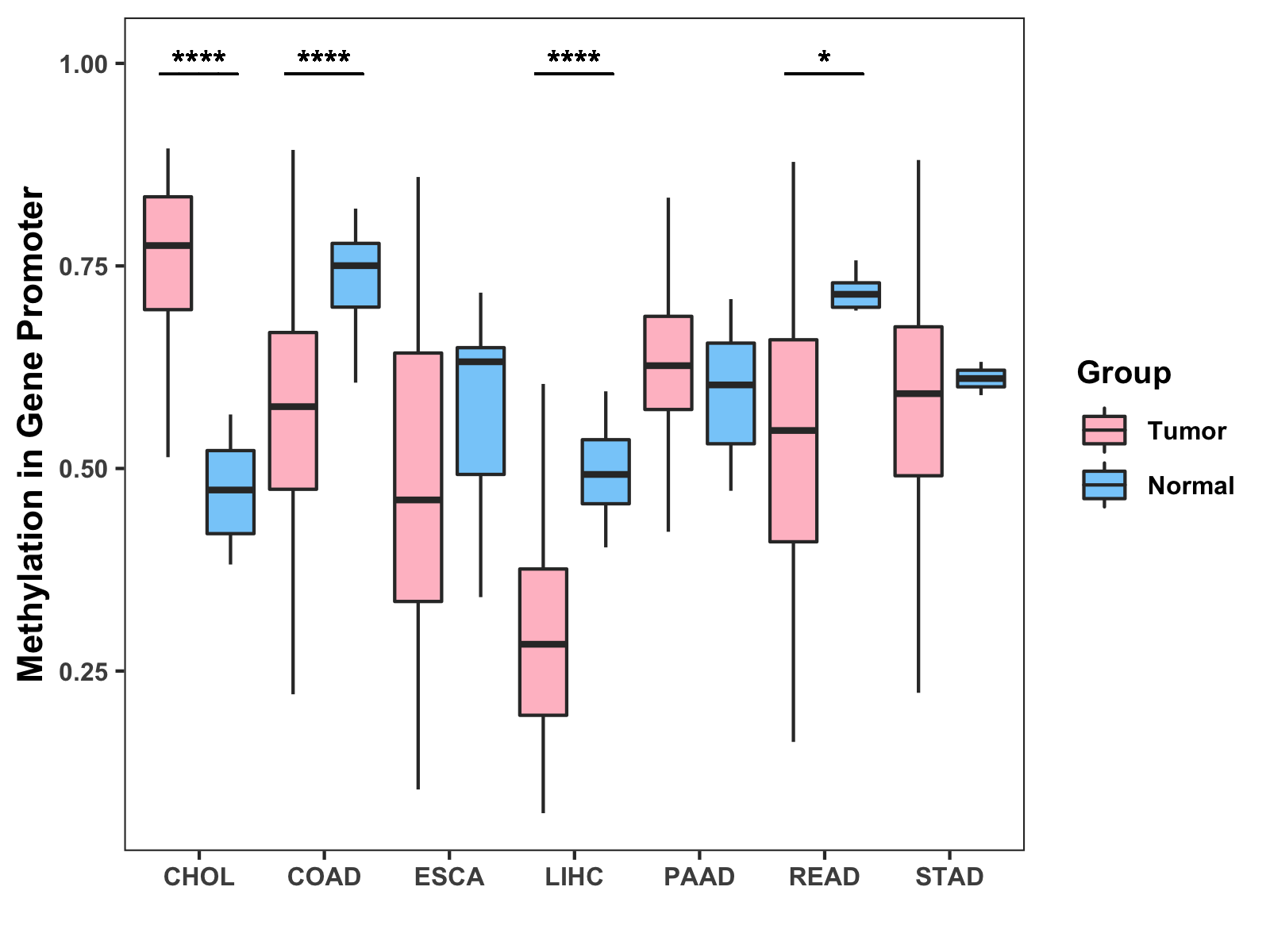 Boxplot of All Gastrointestinal Cancer ( * : 0.01-0.05 , ** : 0.005-0.01 , *** : 0.0001-0.005 , **** : < 0.0001 ) |