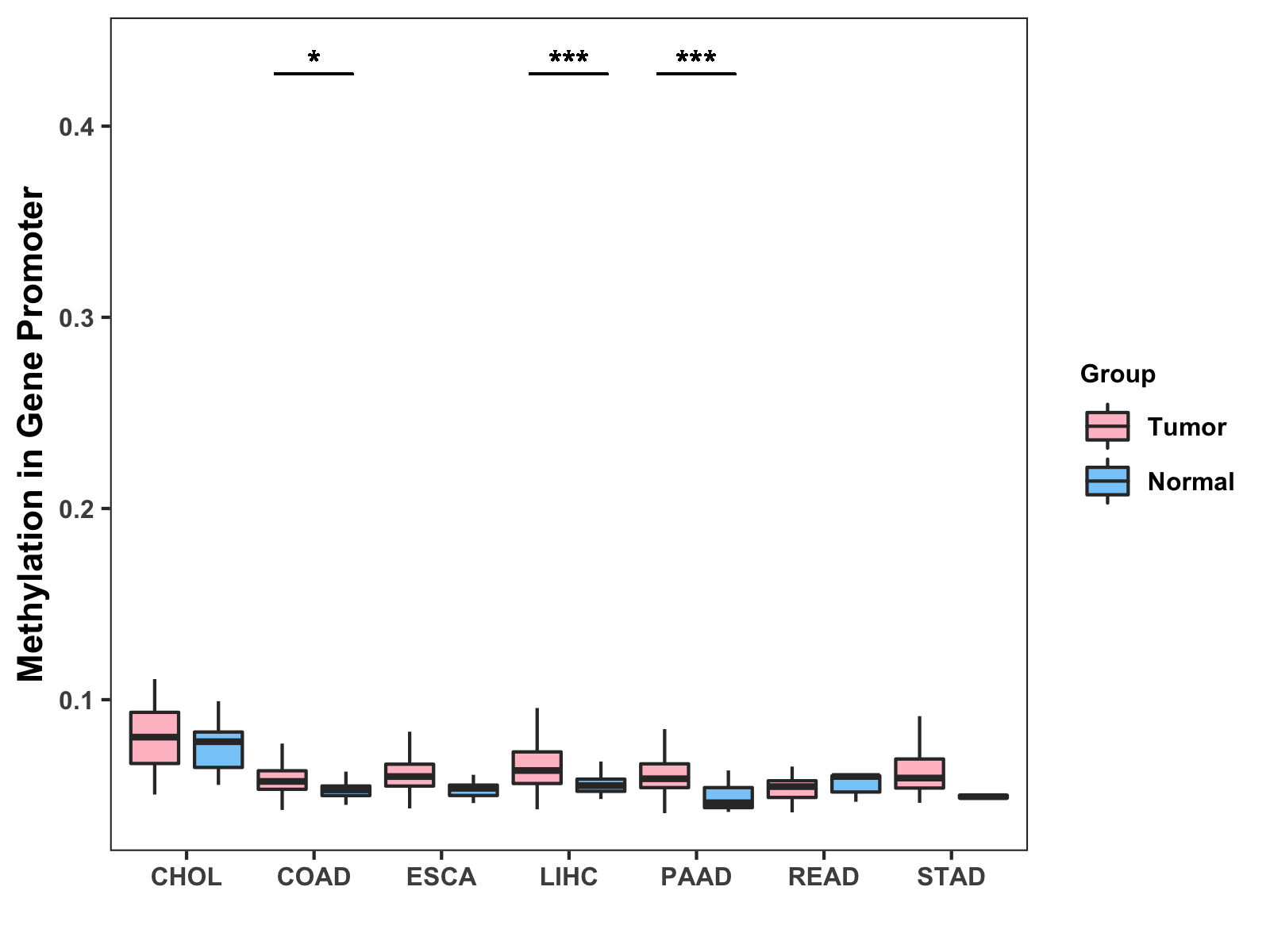Boxplot of All Gastrointestinal Cancer ( * : 0.01-0.05 , ** : 0.005-0.01 , *** : 0.0001-0.005 , **** : < 0.0001 ) |