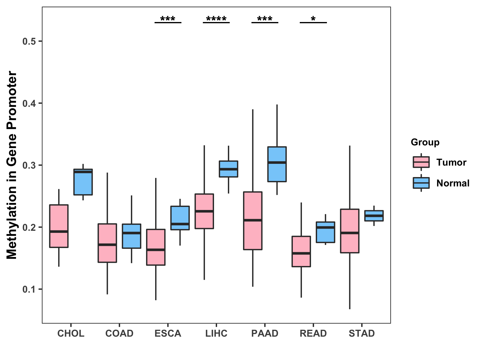 Boxplot of All Gastrointestinal Cancer ( * : 0.01-0.05 , ** : 0.005-0.01 , *** : 0.0001-0.005 , **** : < 0.0001 ) |