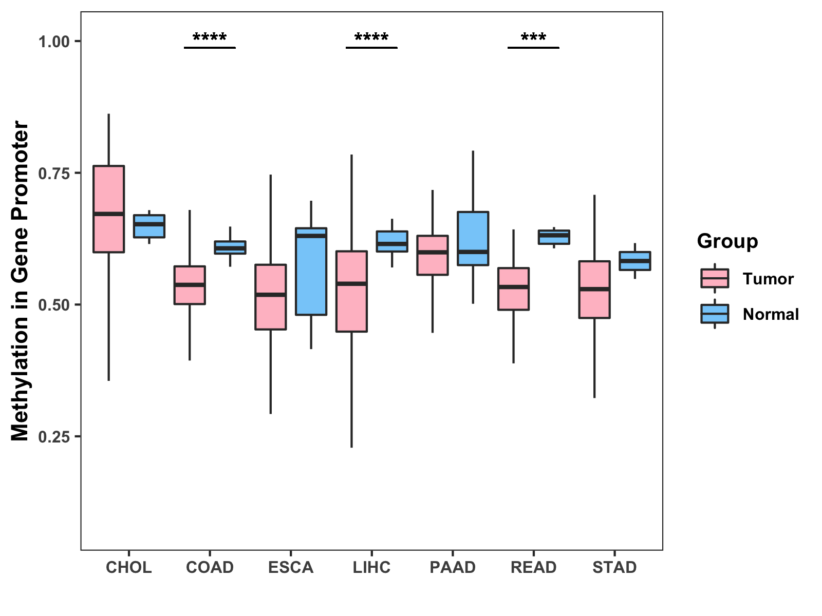 Boxplot of All Gastrointestinal Cancer ( * : 0.01-0.05 , ** : 0.005-0.01 , *** : 0.0001-0.005 , **** : < 0.0001 ) |