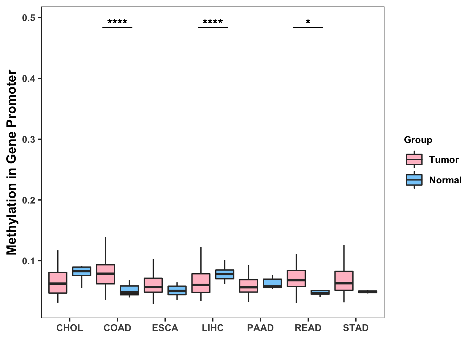 Boxplot of All Gastrointestinal Cancer ( * : 0.01-0.05 , ** : 0.005-0.01 , *** : 0.0001-0.005 , **** : < 0.0001 ) |