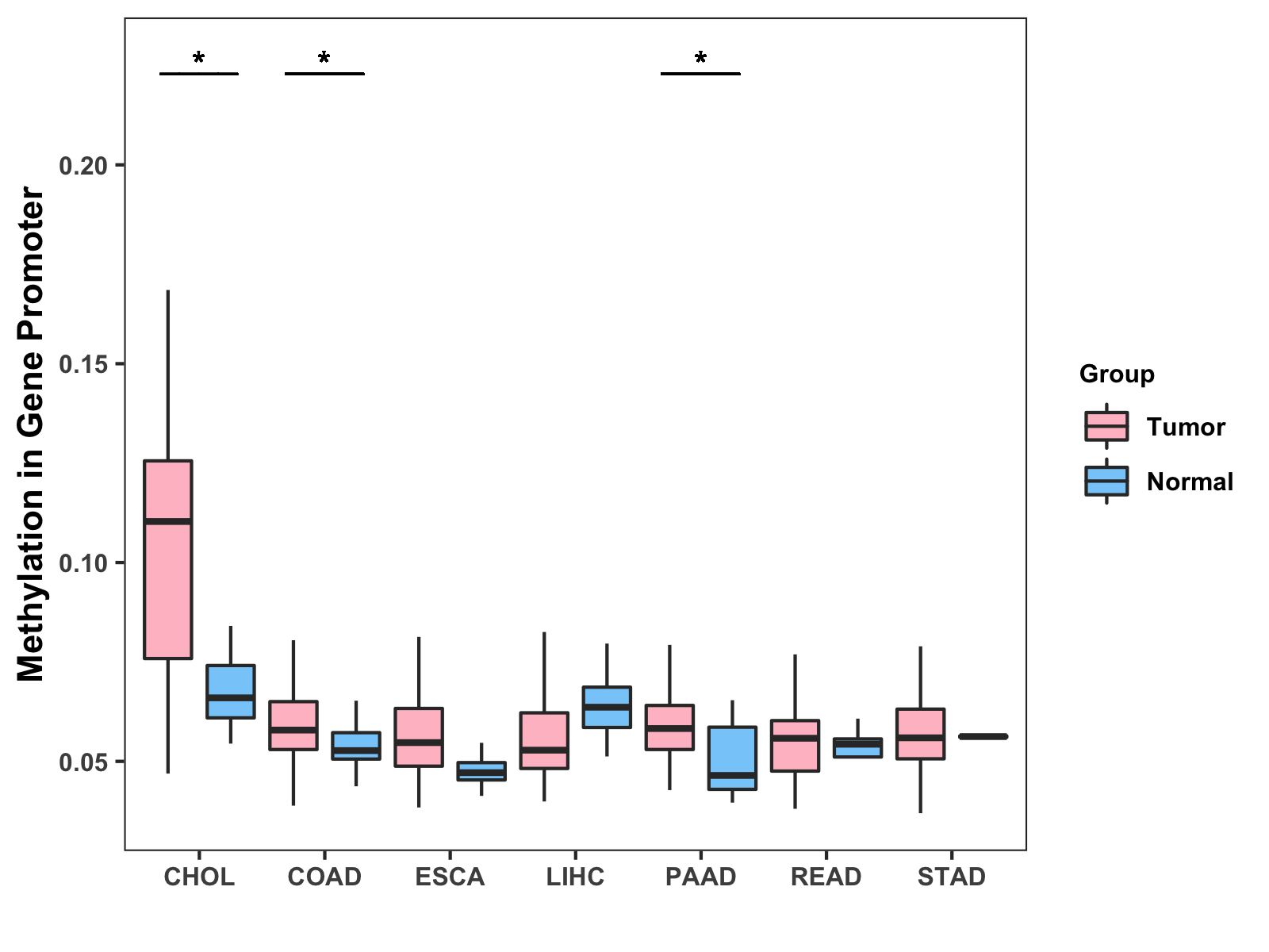 Boxplot of All Gastrointestinal Cancer ( * : 0.01-0.05 , ** : 0.005-0.01 , *** : 0.0001-0.005 , **** : < 0.0001 ) |