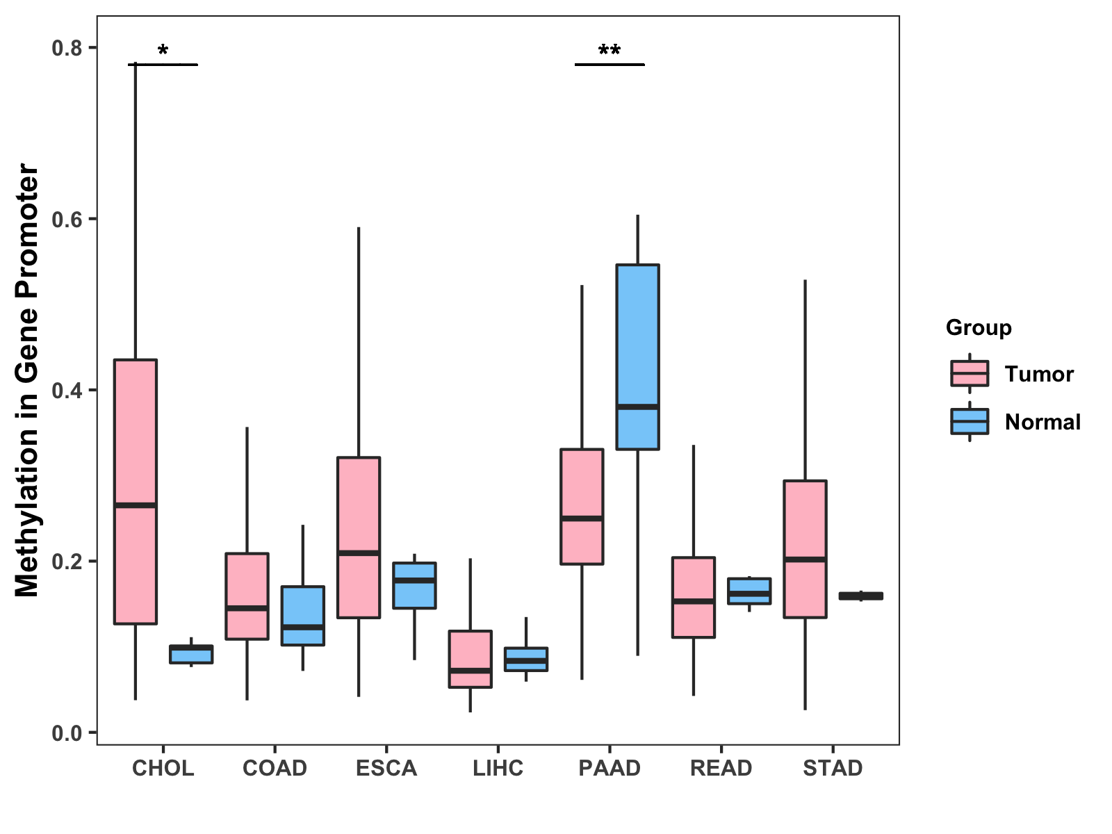 Boxplot of All Gastrointestinal Cancer ( * : 0.01-0.05 , ** : 0.005-0.01 , *** : 0.0001-0.005 , **** : < 0.0001 ) |