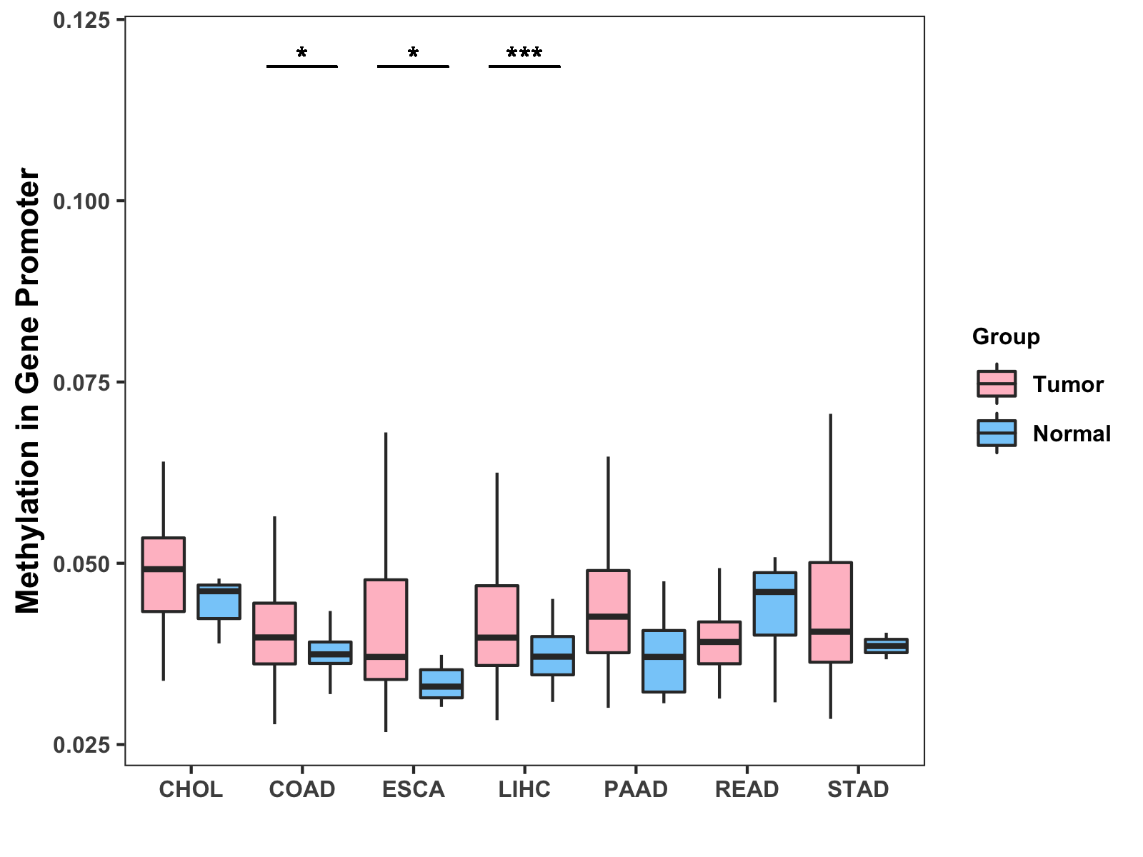 Boxplot of All Gastrointestinal Cancer ( * : 0.01-0.05 , ** : 0.005-0.01 , *** : 0.0001-0.005 , **** : < 0.0001 ) |