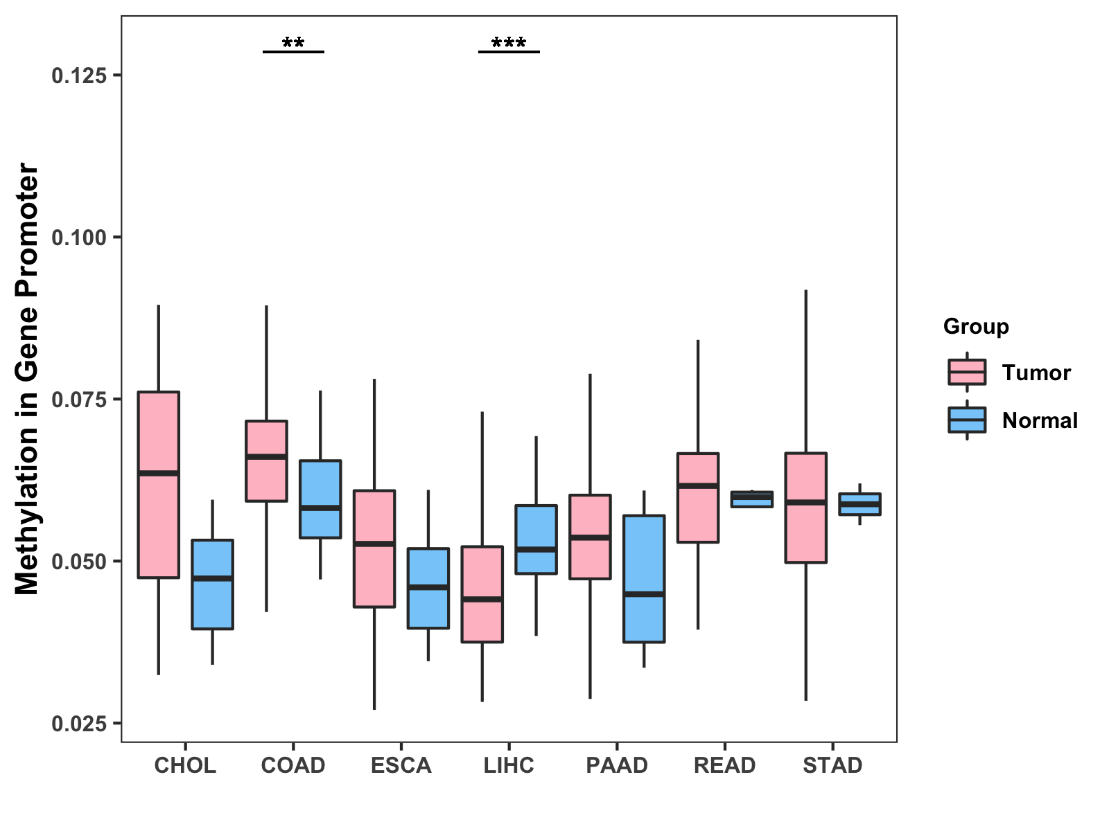 Boxplot of All Gastrointestinal Cancer ( * : 0.01-0.05 , ** : 0.005-0.01 , *** : 0.0001-0.005 , **** : < 0.0001 ) |