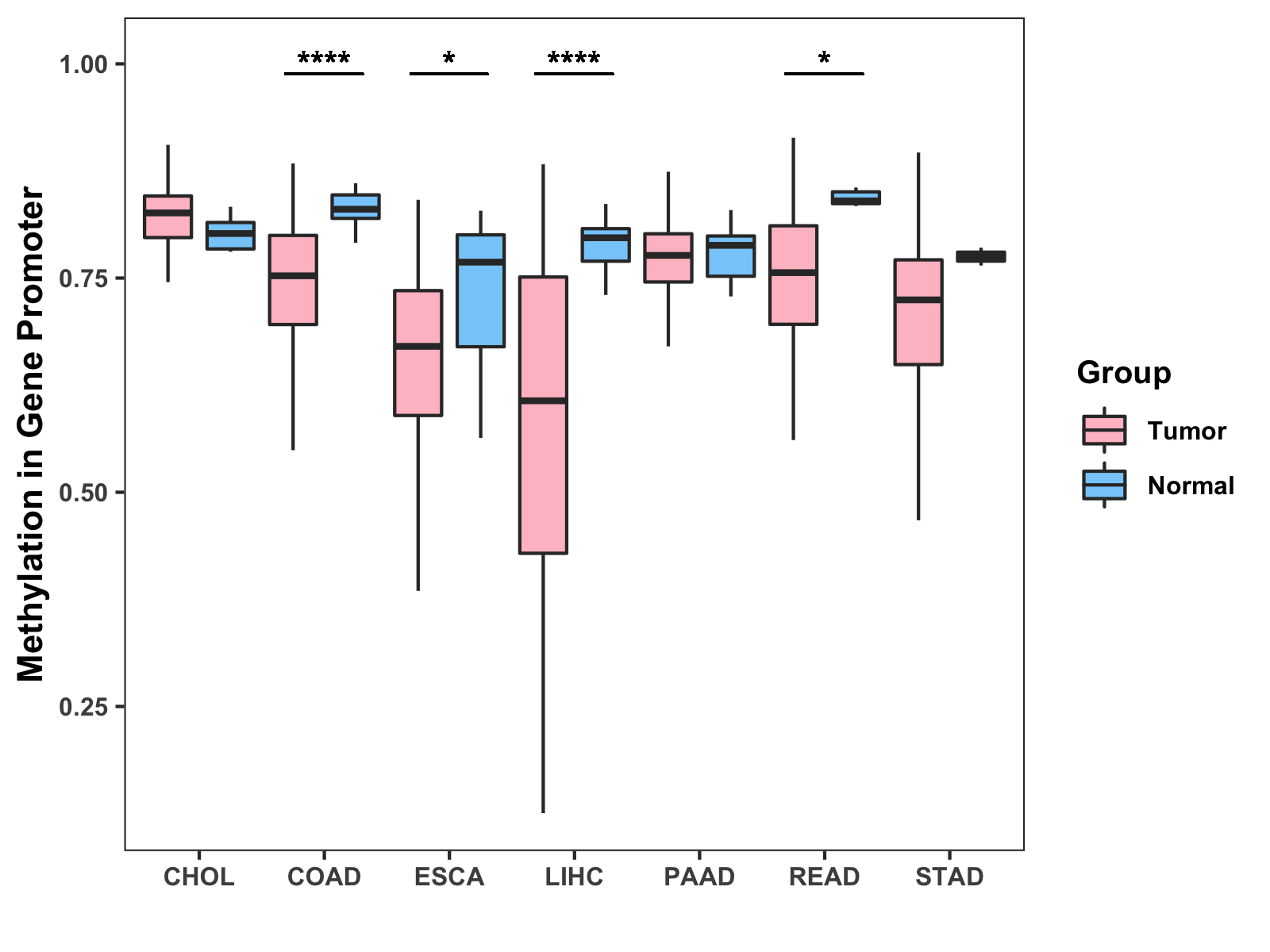 Boxplot of All Gastrointestinal Cancer ( * : 0.01-0.05 , ** : 0.005-0.01 , *** : 0.0001-0.005 , **** : < 0.0001 ) |