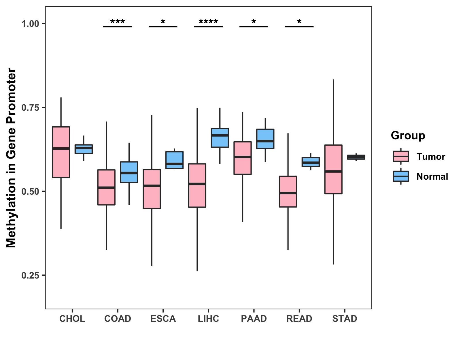 Boxplot of All Gastrointestinal Cancer ( * : 0.01-0.05 , ** : 0.005-0.01 , *** : 0.0001-0.005 , **** : < 0.0001 ) |