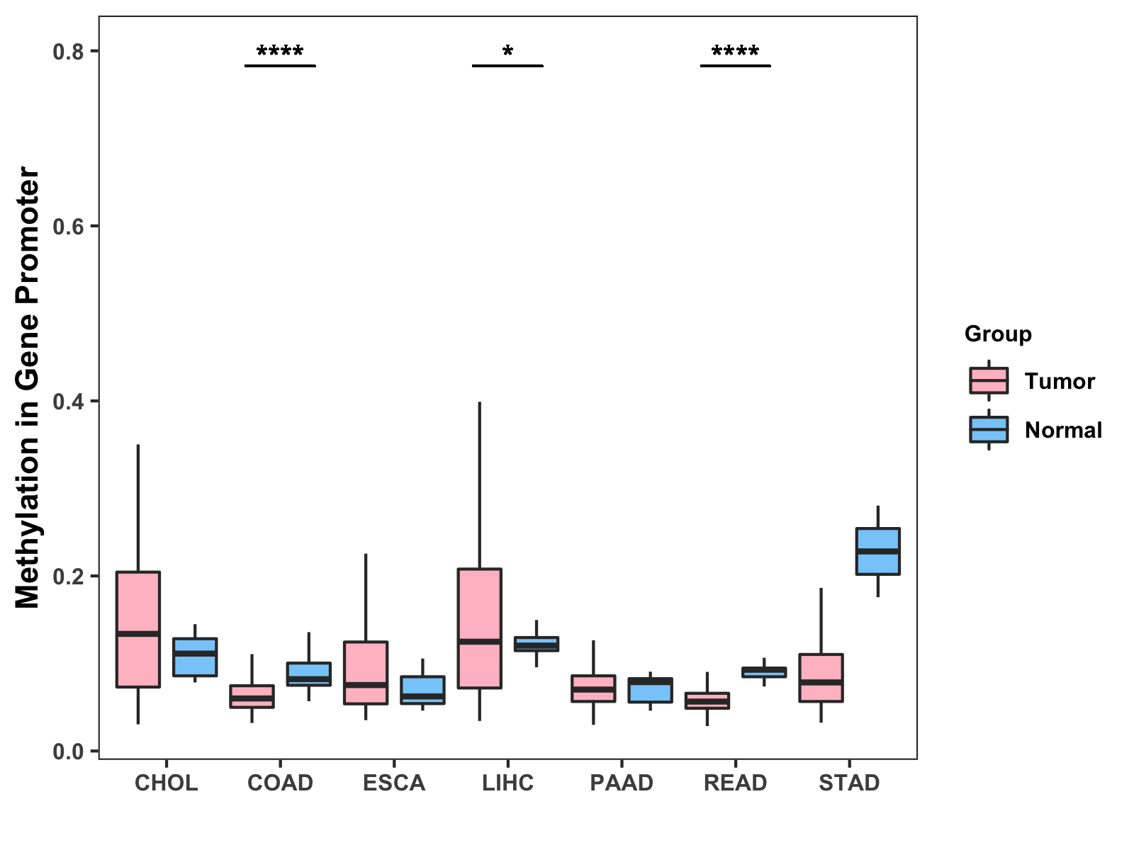 Boxplot of All Gastrointestinal Cancer ( * : 0.01-0.05 , ** : 0.005-0.01 , *** : 0.0001-0.005 , **** : < 0.0001 ) |