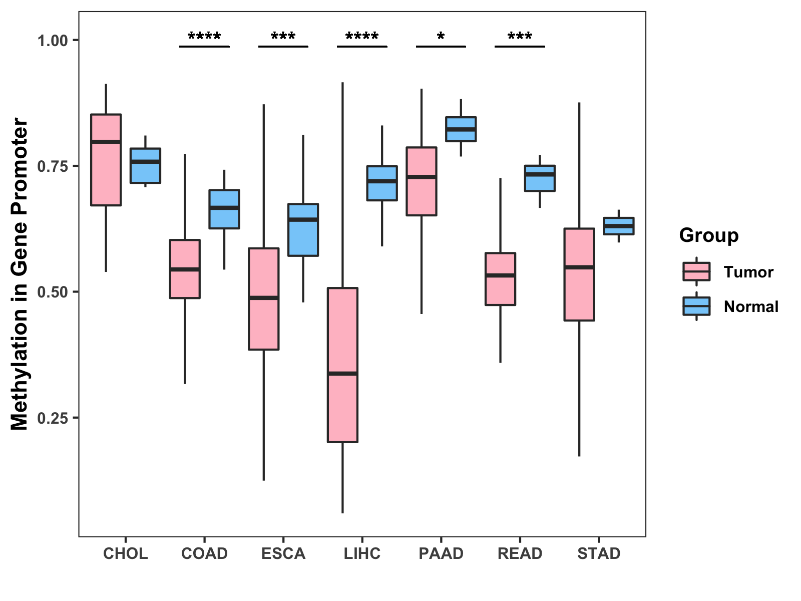 Boxplot of All Gastrointestinal Cancer ( * : 0.01-0.05 , ** : 0.005-0.01 , *** : 0.0001-0.005 , **** : < 0.0001 ) |