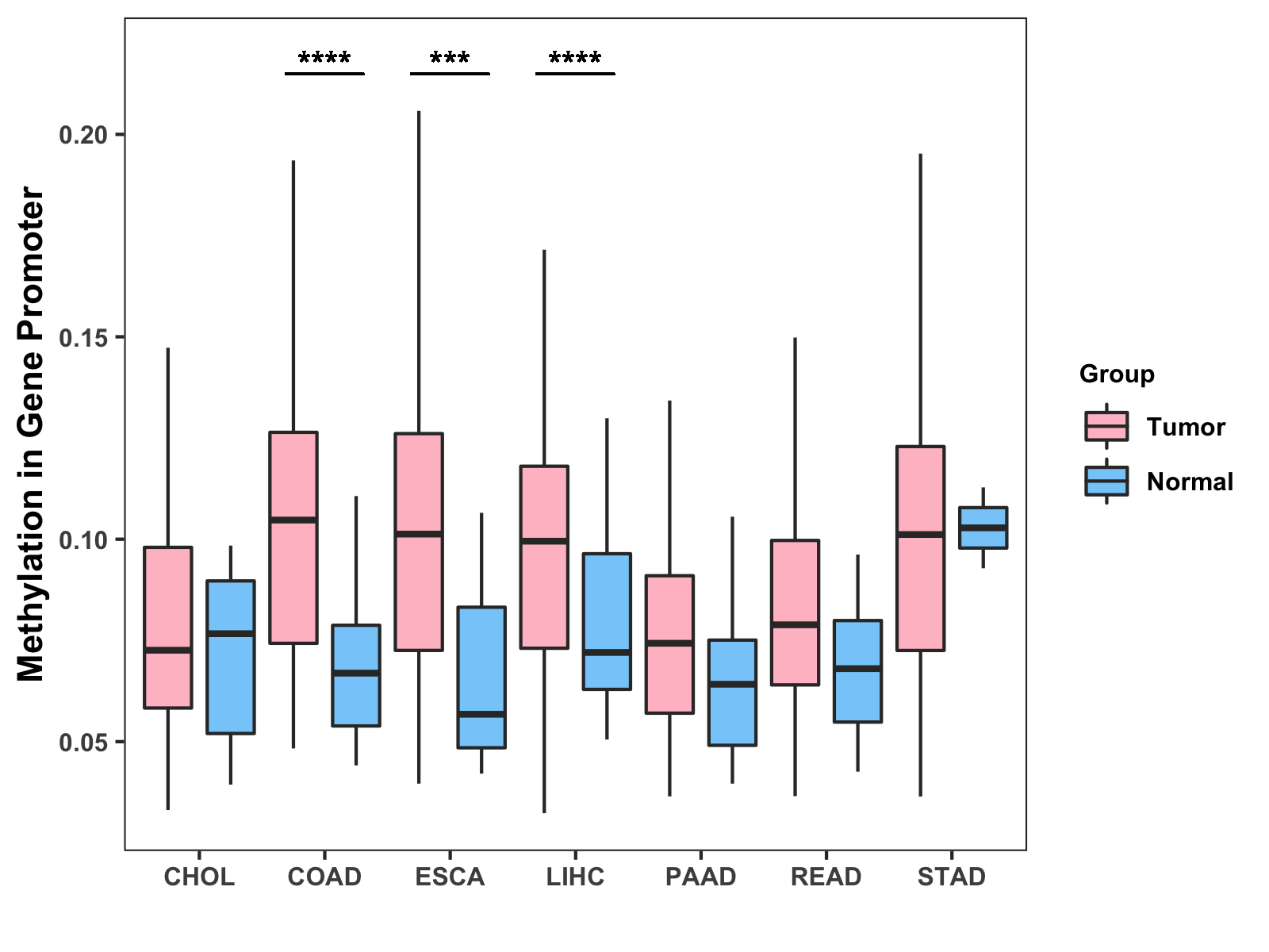 Boxplot of All Gastrointestinal Cancer ( * : 0.01-0.05 , ** : 0.005-0.01 , *** : 0.0001-0.005 , **** : < 0.0001 ) |