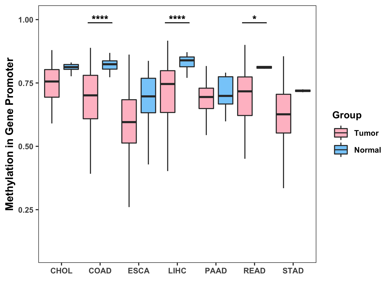 Boxplot of All Gastrointestinal Cancer ( * : 0.01-0.05 , ** : 0.005-0.01 , *** : 0.0001-0.005 , **** : < 0.0001 ) |