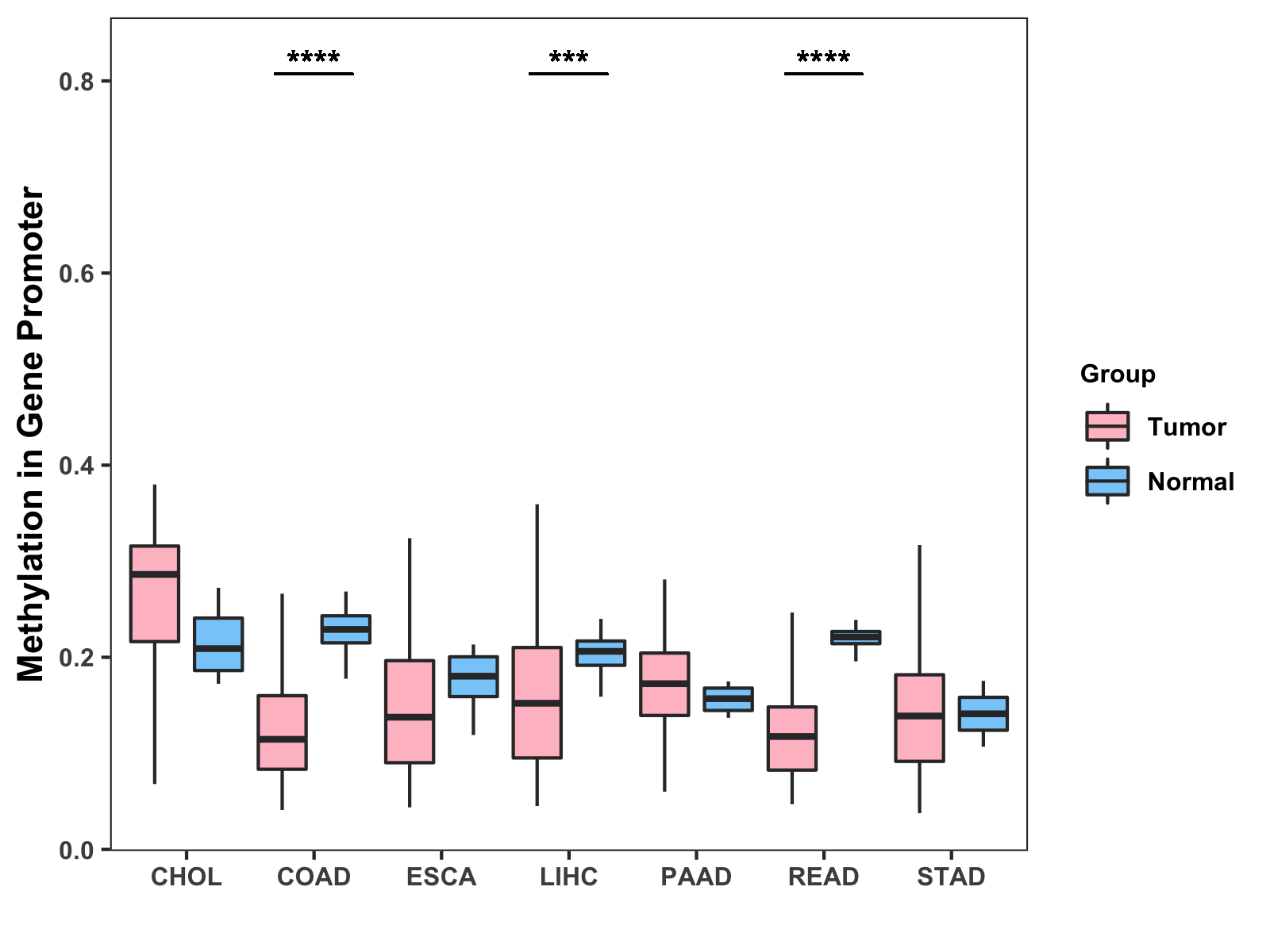 Boxplot of All Gastrointestinal Cancer ( * : 0.01-0.05 , ** : 0.005-0.01 , *** : 0.0001-0.005 , **** : < 0.0001 ) |