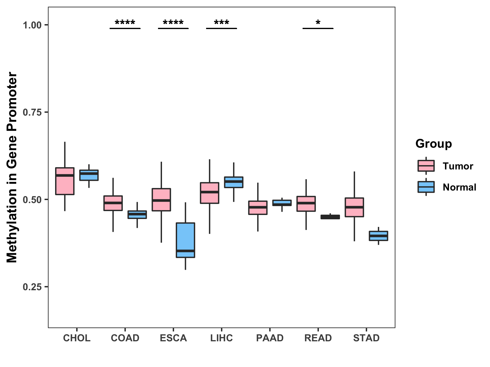 Boxplot of All Gastrointestinal Cancer ( * : 0.01-0.05 , ** : 0.005-0.01 , *** : 0.0001-0.005 , **** : < 0.0001 ) |