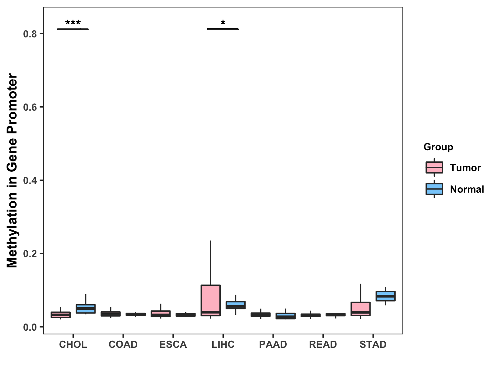 Boxplot of All Gastrointestinal Cancer ( * : 0.01-0.05 , ** : 0.005-0.01 , *** : 0.0001-0.005 , **** : < 0.0001 ) |