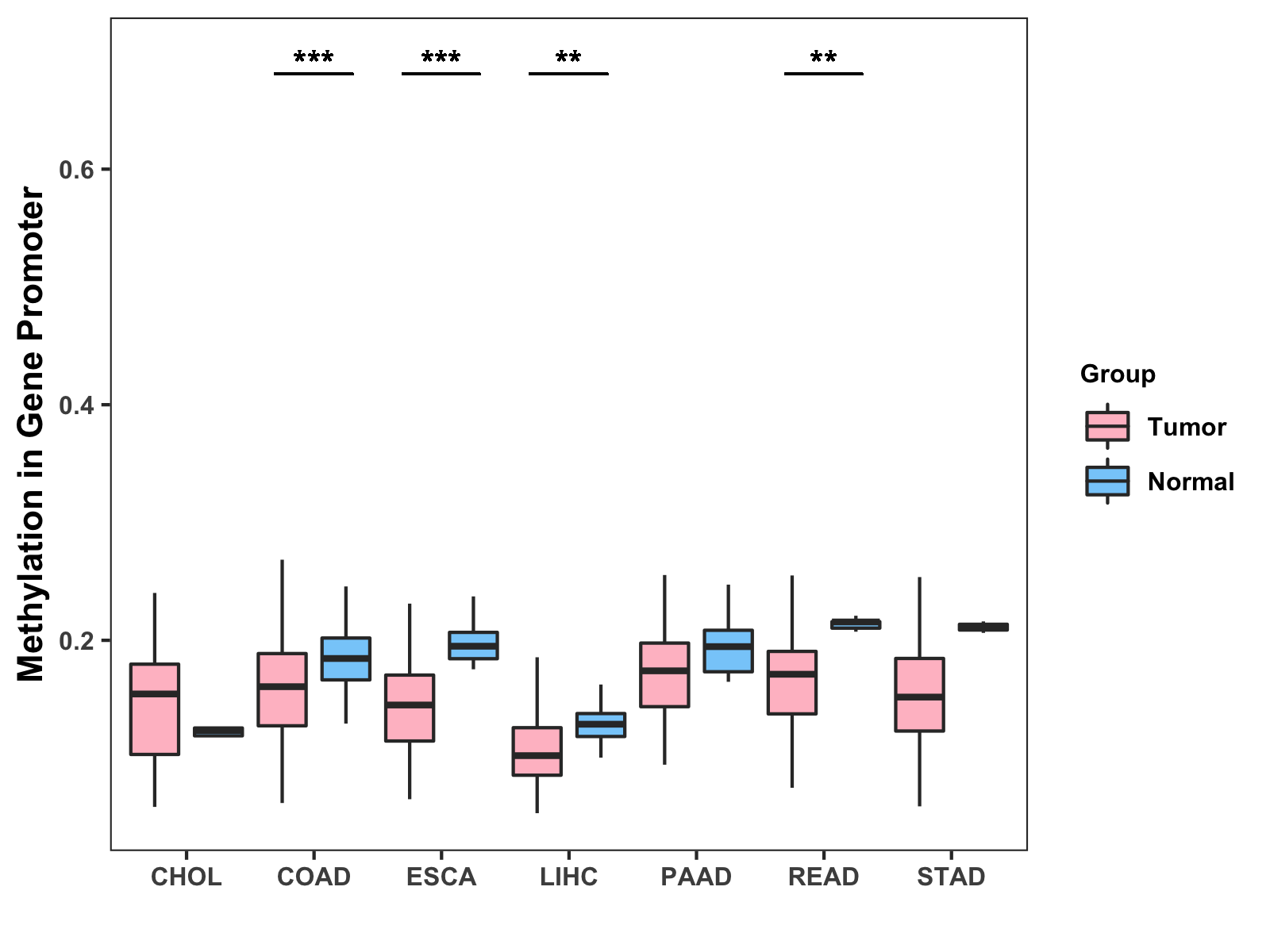 Boxplot of All Gastrointestinal Cancer ( * : 0.01-0.05 , ** : 0.005-0.01 , *** : 0.0001-0.005 , **** : < 0.0001 ) |