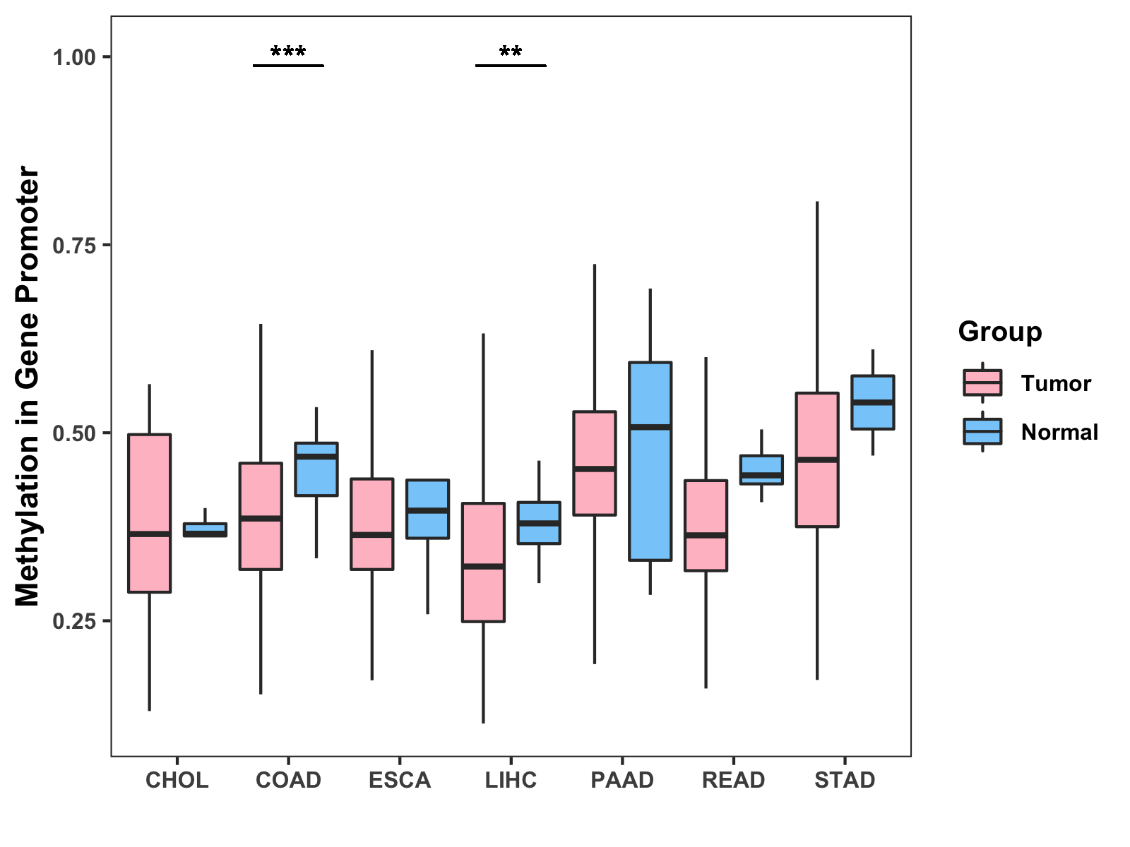 Boxplot of All Gastrointestinal Cancer ( * : 0.01-0.05 , ** : 0.005-0.01 , *** : 0.0001-0.005 , **** : < 0.0001 ) |