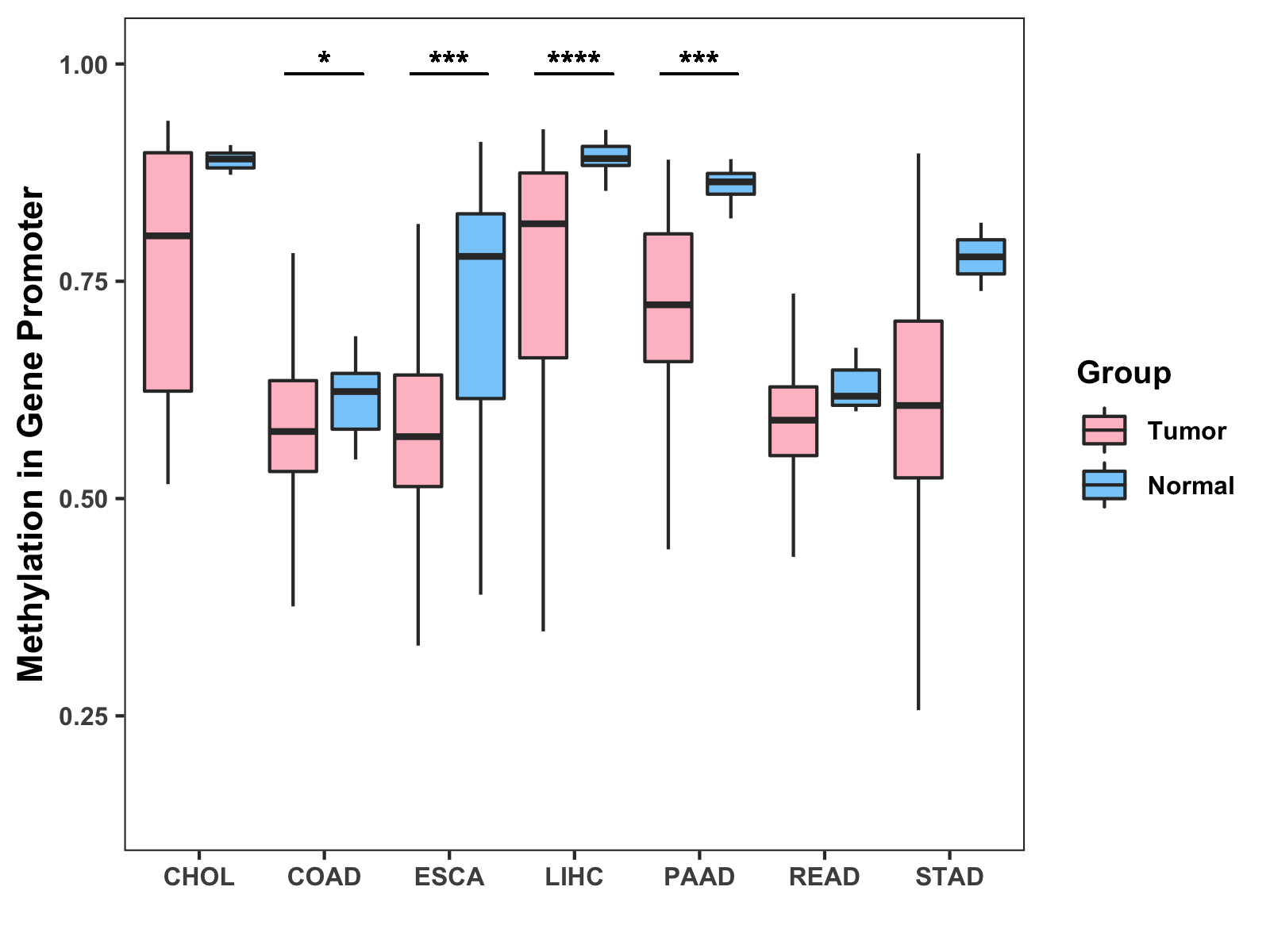 Boxplot of All Gastrointestinal Cancer ( * : 0.01-0.05 , ** : 0.005-0.01 , *** : 0.0001-0.005 , **** : < 0.0001 ) |