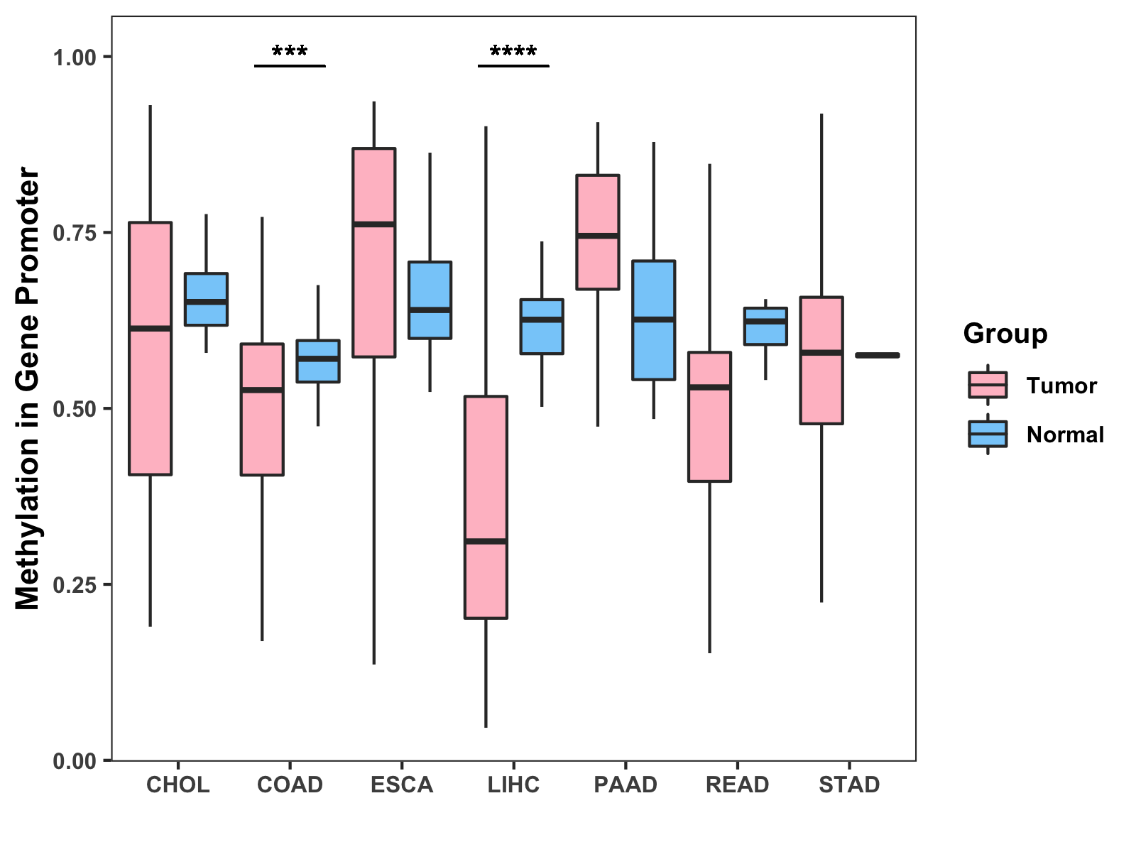 Boxplot of All Gastrointestinal Cancer ( * : 0.01-0.05 , ** : 0.005-0.01 , *** : 0.0001-0.005 , **** : < 0.0001 ) |