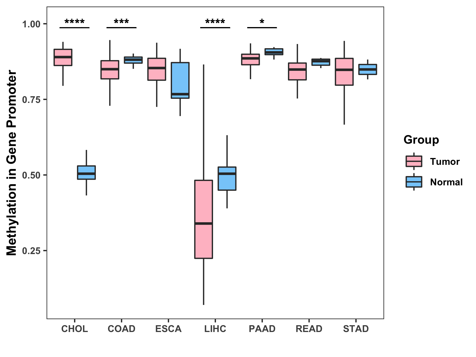 Boxplot of All Gastrointestinal Cancer ( * : 0.01-0.05 , ** : 0.005-0.01 , *** : 0.0001-0.005 , **** : < 0.0001 ) |