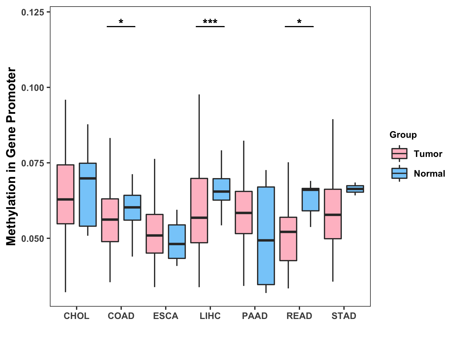 Boxplot of All Gastrointestinal Cancer ( * : 0.01-0.05 , ** : 0.005-0.01 , *** : 0.0001-0.005 , **** : < 0.0001 ) |