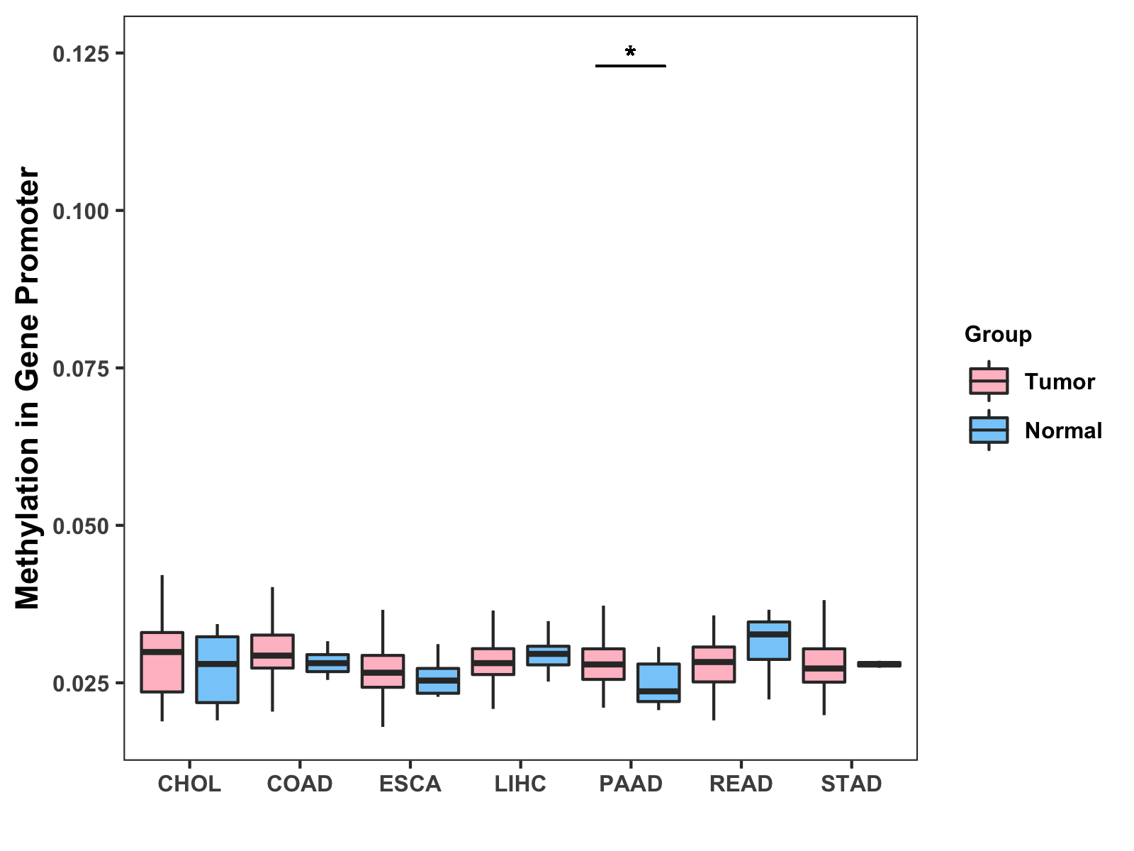 Boxplot of All Gastrointestinal Cancer ( * : 0.01-0.05 , ** : 0.005-0.01 , *** : 0.0001-0.005 , **** : < 0.0001 ) |