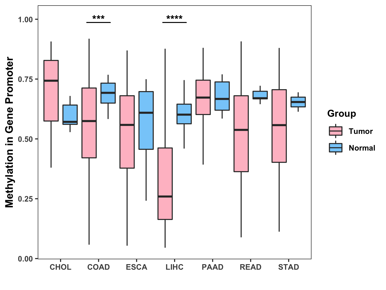 Boxplot of All Gastrointestinal Cancer ( * : 0.01-0.05 , ** : 0.005-0.01 , *** : 0.0001-0.005 , **** : < 0.0001 ) |