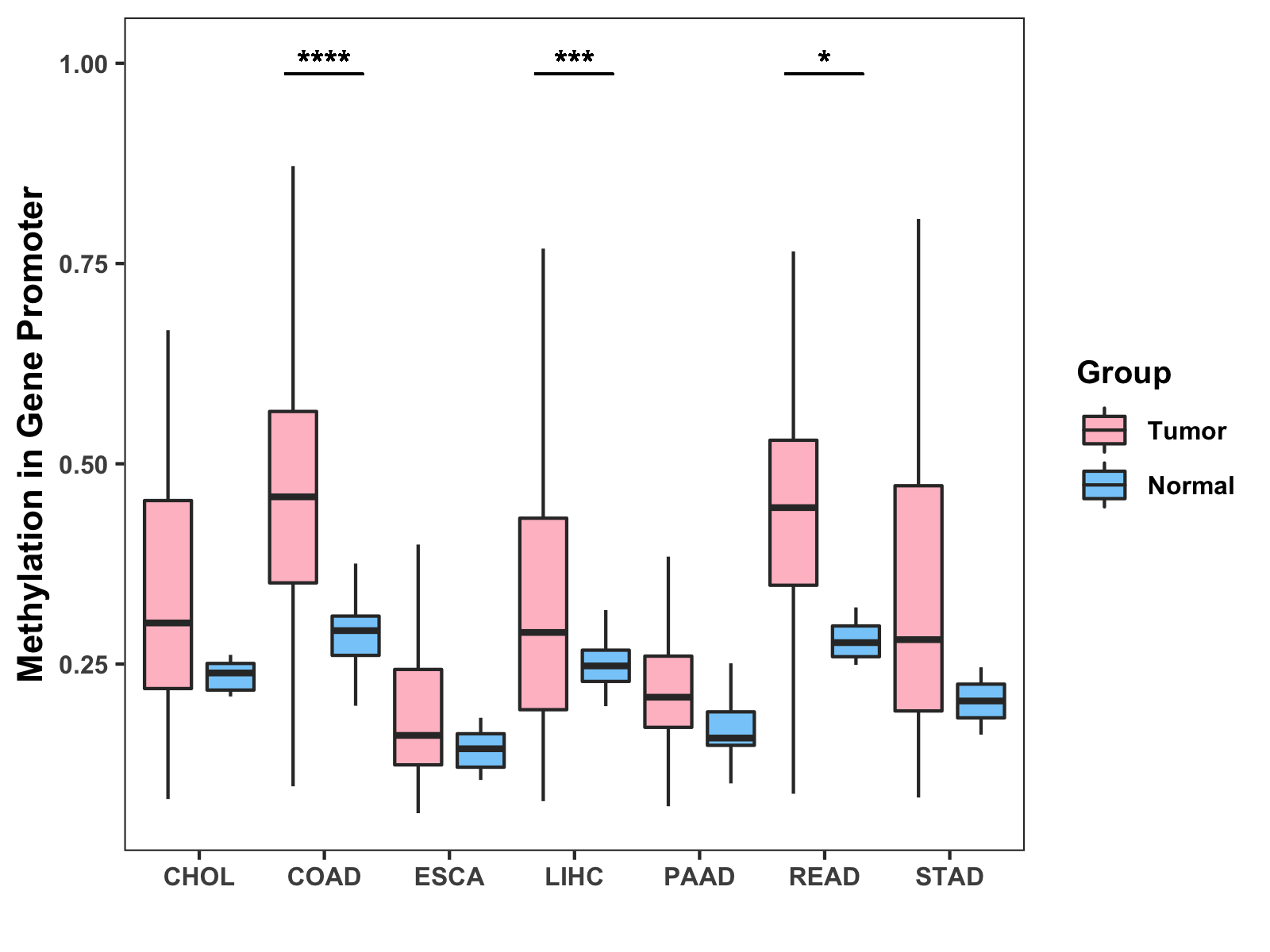 Boxplot of All Gastrointestinal Cancer ( * : 0.01-0.05 , ** : 0.005-0.01 , *** : 0.0001-0.005 , **** : < 0.0001 ) |