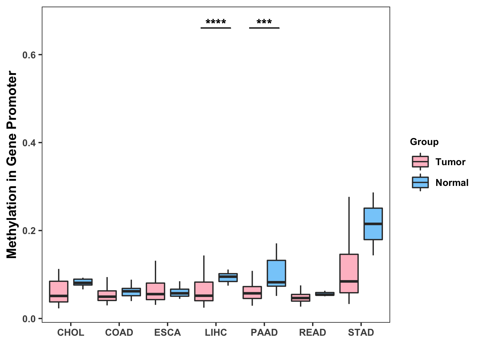Boxplot of All Gastrointestinal Cancer ( * : 0.01-0.05 , ** : 0.005-0.01 , *** : 0.0001-0.005 , **** : < 0.0001 ) |