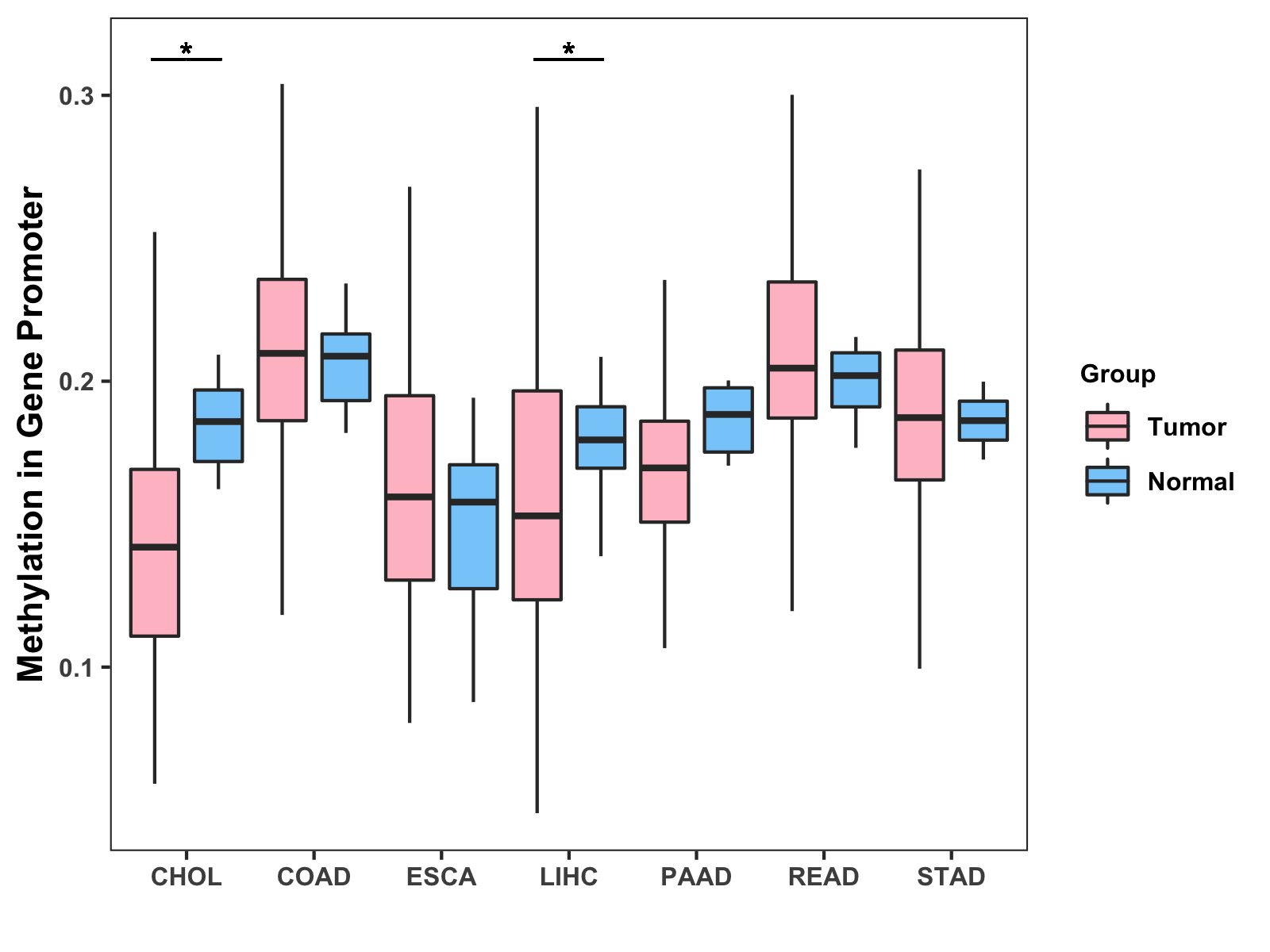 Boxplot of All Gastrointestinal Cancer ( * : 0.01-0.05 , ** : 0.005-0.01 , *** : 0.0001-0.005 , **** : < 0.0001 ) |