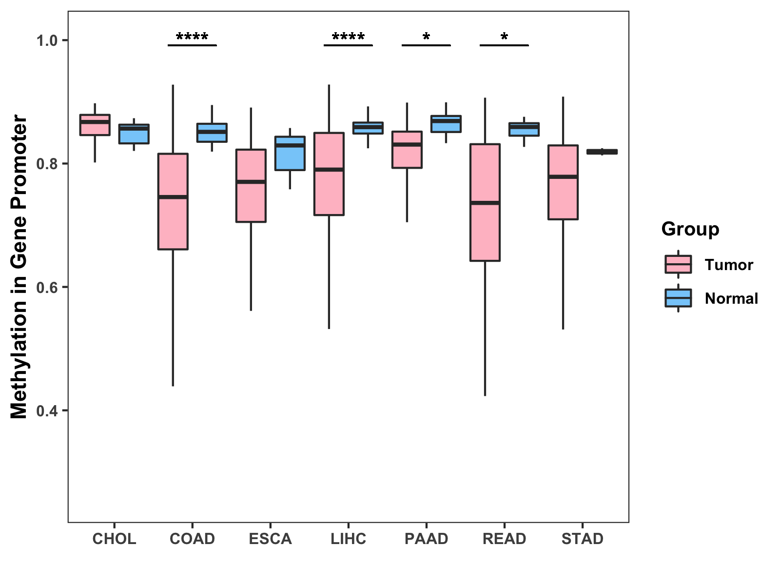 Boxplot of All Gastrointestinal Cancer ( * : 0.01-0.05 , ** : 0.005-0.01 , *** : 0.0001-0.005 , **** : < 0.0001 ) |