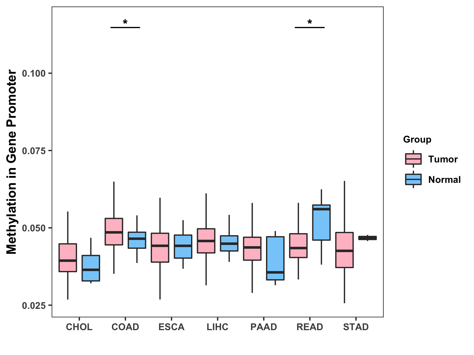 Boxplot of All Gastrointestinal Cancer ( * : 0.01-0.05 , ** : 0.005-0.01 , *** : 0.0001-0.005 , **** : < 0.0001 ) |