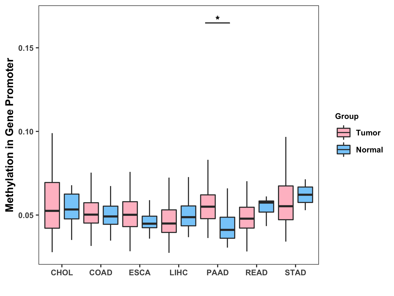 Boxplot of All Gastrointestinal Cancer ( * : 0.01-0.05 , ** : 0.005-0.01 , *** : 0.0001-0.005 , **** : < 0.0001 ) |