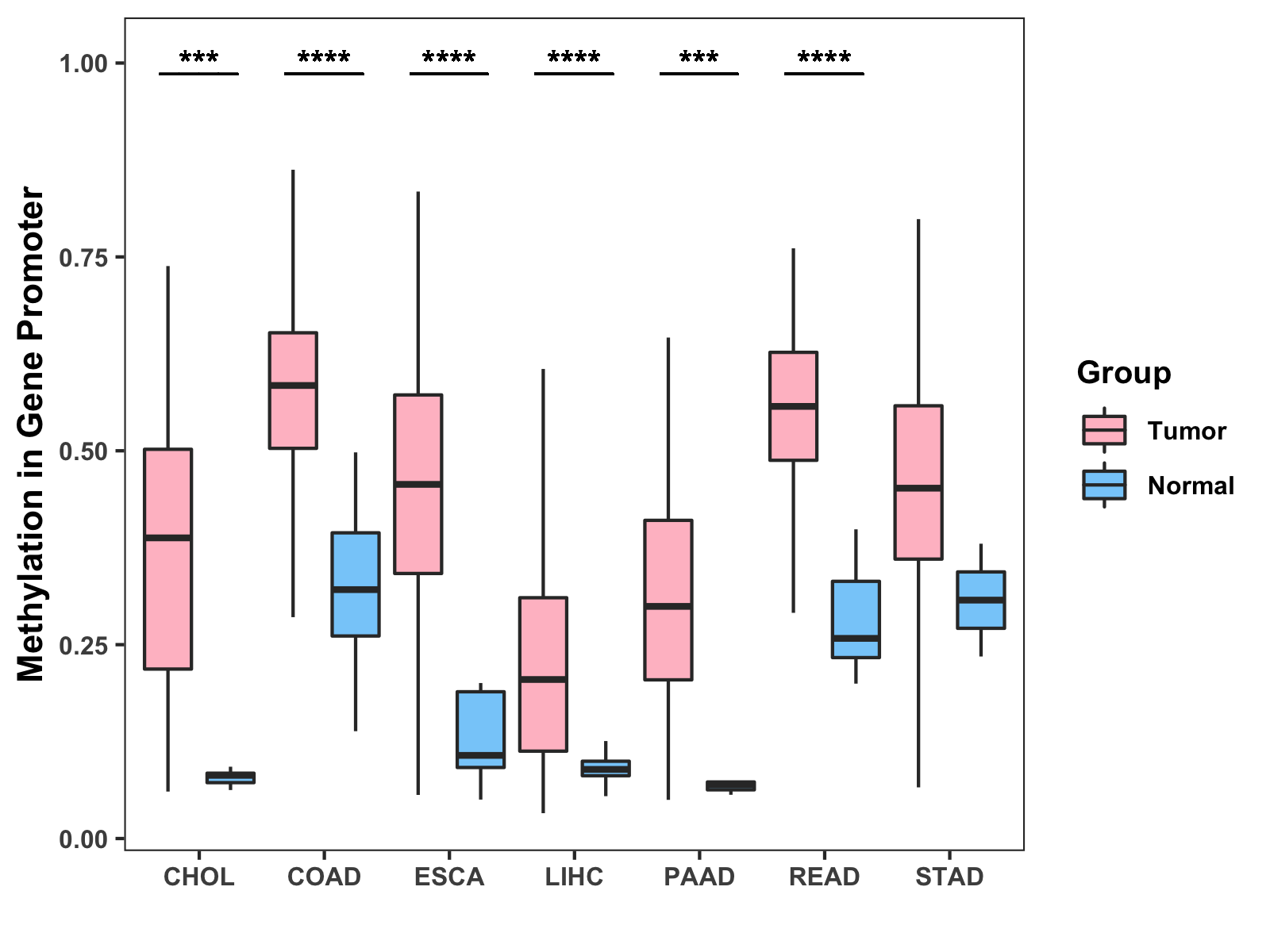 Boxplot of All Gastrointestinal Cancer ( * : 0.01-0.05 , ** : 0.005-0.01 , *** : 0.0001-0.005 , **** : < 0.0001 ) |